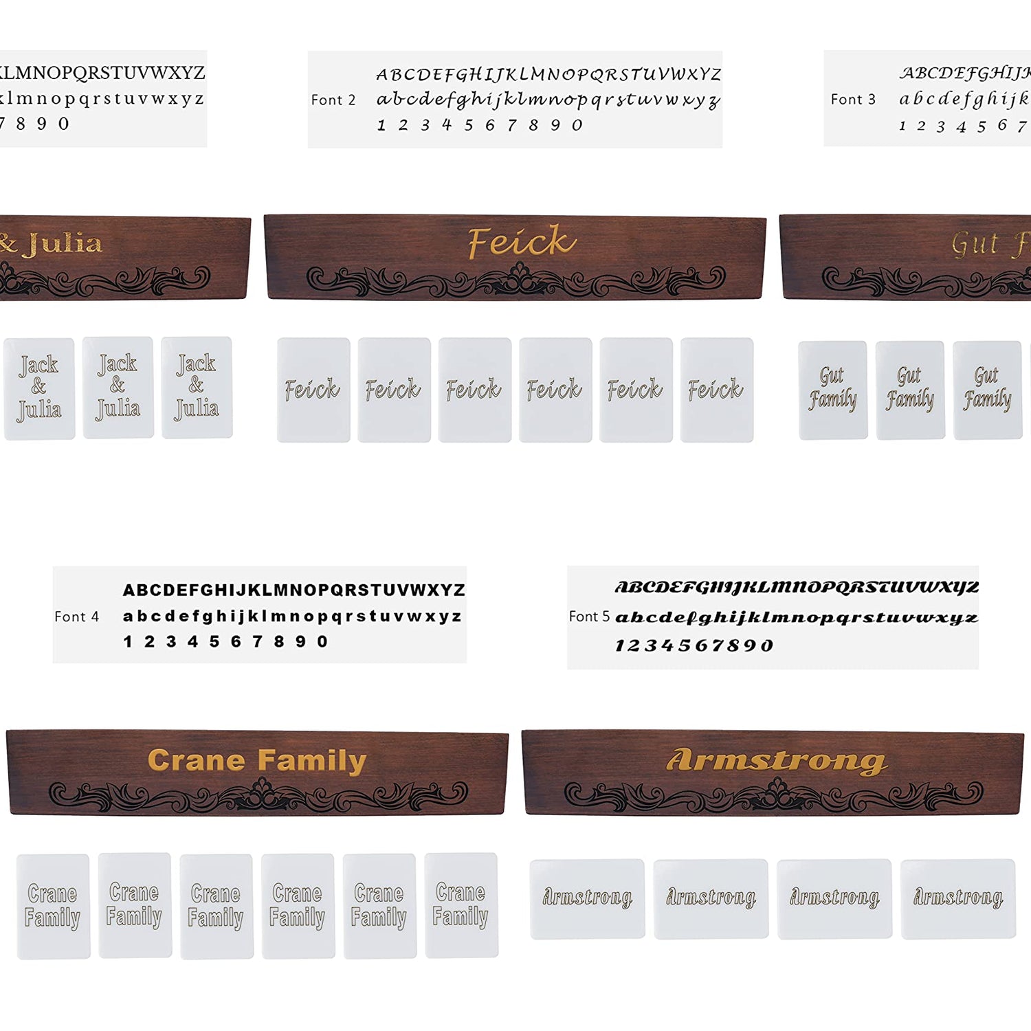 *** HOW TO PLACE YOUR ORDER *** You will see two options when you click "Customize Now" button. Engraving could be done on "only racks" and "racks and tiles". ---> If you want only your racks to be engraved and tiles not be engraved; > Choose "Engrave Only Racks" from options and and choose your font from lower options menu named as "Choose Your Font". Then add your personalization in the input form below options. We could engrave each rack differently or all same or whatever you want. Here are some samples to place your order the way you want. If you write "Laura Family" on input form, then all 4 racks will be engraved "Laura Family". If you want all racks different texts, then just write like that: " Rack1: Andra, Rack2: Shanna&Sean, Rack3: Steve&Camelia, Rack4: Benny, Sasha&Pissy ". ---> If you want your racks and tiles to be engraved -> Choose "Engrave Racks+Tiles" from options and same procedure for racks as defined up. Please add definers for racks and tiles in input form. Here are some samples to place your order the way you want. If you write "Racks: Laura Family , Tiles: forever with love" on input form, then all 4 racks will be engraved "Laura Family" and tiles will be engraved "forever with love". If you want all racks different texts, then just write like that: " Rack1: Andra, Rack2: Shanna&Sean, Rack3: Steve&Camelia, Rack4: Benny, Sasha&Pissy, Tiles: forever with love". And just keep in mind if you want your tiles to be engraved with other font than racks; just add it in personalization section. I assume you want your racks Font1 but tiles Font3. Then add it in your order just like that: " Racks:Laura Family, Tiles Font3: forever with love". The font you choose from menu will be assigned to racks and tiles if you don't add your font selection for tiles in input form. *** If you want your tiles to be engraved logo/design or any shape -> Add Your Image and allign it with the area shown on picture.