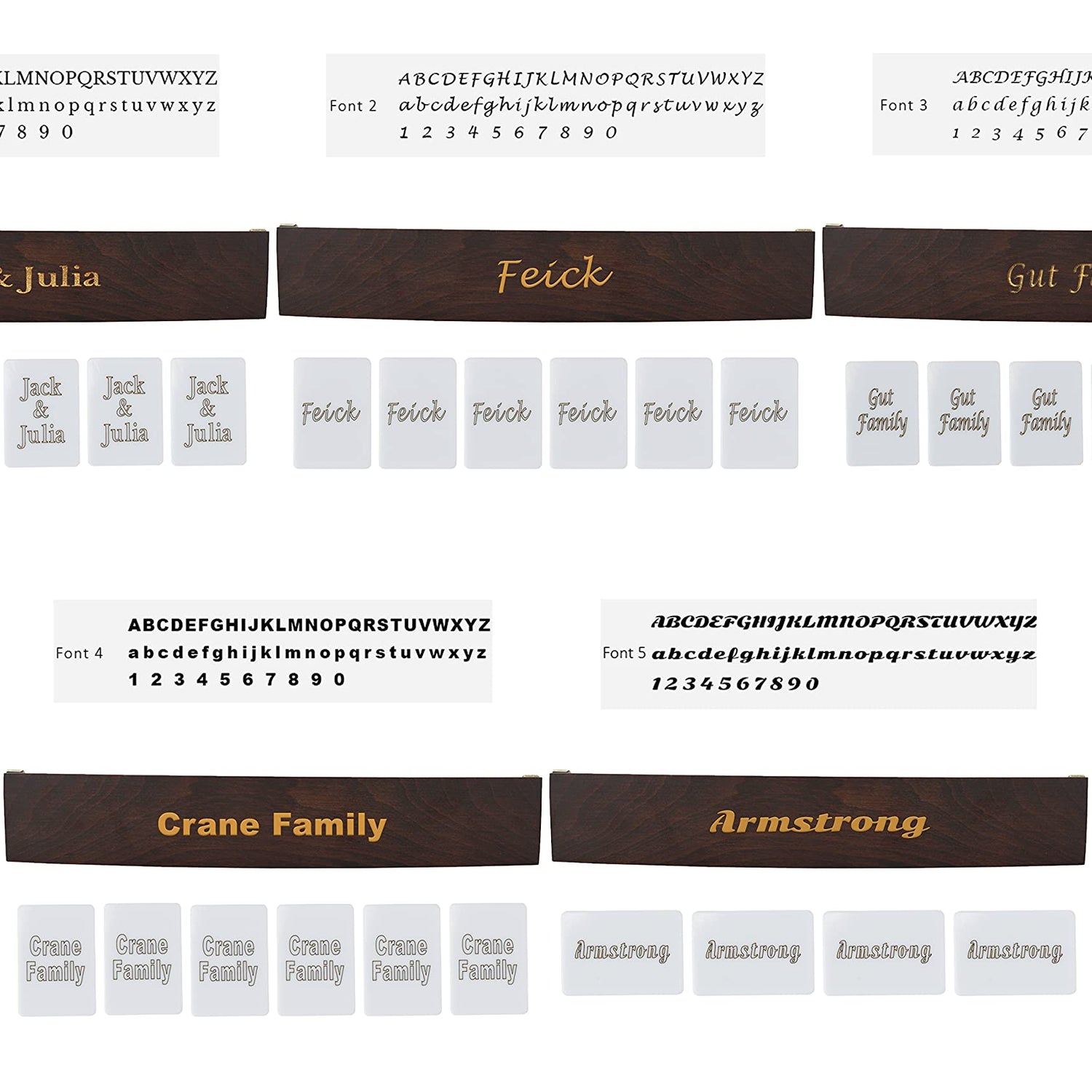 Details: *** HOW TO PLACE YOUR ORDER *** You will see two options when you click "Customize Now" button. Engraving could be done on "only racks" and "racks and tiles". ---> If you want only your racks to be engraved and tiles not be engraved; > Choose "Engrave Only Racks" from options and and choose your font from lower options menu named as "Choose Your Font". Then add your personalization in the input form below options. We could engrave each rack differently or all same or whatever you want. Here are some samples to place your order the way you want. If you write "Laura Family" on input form, then all 4 racks will be engraved "Laura Family". If you want all racks different texts, then just write like that: " Rack1: Andra, Rack2: Shanna&Sean, Rack3: Steve&Camelia, Rack4: Benny, Sasha&Pissy ". ---> If you want your racks and tiles to be engraved -> Choose "Engrave Racks+Tiles" from options and same procedure for racks as defined up. Please add definers for racks and tiles in input form. Here are some samples to place your order the way you want. If you write "Racks: Laura Family , Tiles: forever with love" on input form, then all 4 racks will be engraved "Laura Family" and tiles will be engraved "forever with love". If you want all racks different texts, then just write like that: " Rack1: Andra, Rack2: Shanna&Sean, Rack3: Steve&Camelia, Rack4: Benny, Sasha&Pissy, Tiles: forever with love". And just keep in mind if you want your tiles to be engraved with other font than racks; just add it in personalization section. I assume you want your racks Font1 but tiles Font3. Then add it in your order just like that: " Racks:Laura Family, Tiles Font3: forever with love". The font you choose from menu will be assigned to racks and tiles if you don't add your font selection for tiles in input form. *** If you want your tiles to be engraved logo/design or any shape -> Add Your Image and allign it with the area shown on picture.