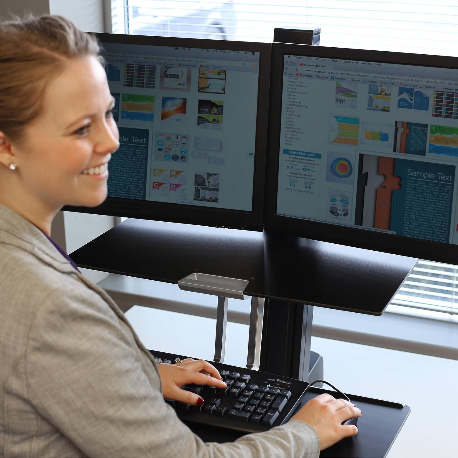 - Ergonomic workspace: Fine-tune your sitting or standing position with 18 inches of worksurface lift plus 5 inches of independent screen height adjustment; adjusts smoothly from minimum monitor height of 8.7 inches to maximum monitor height of 31.5 inches; install screens at a 3 or 8-degree upward angle for optimal viewing