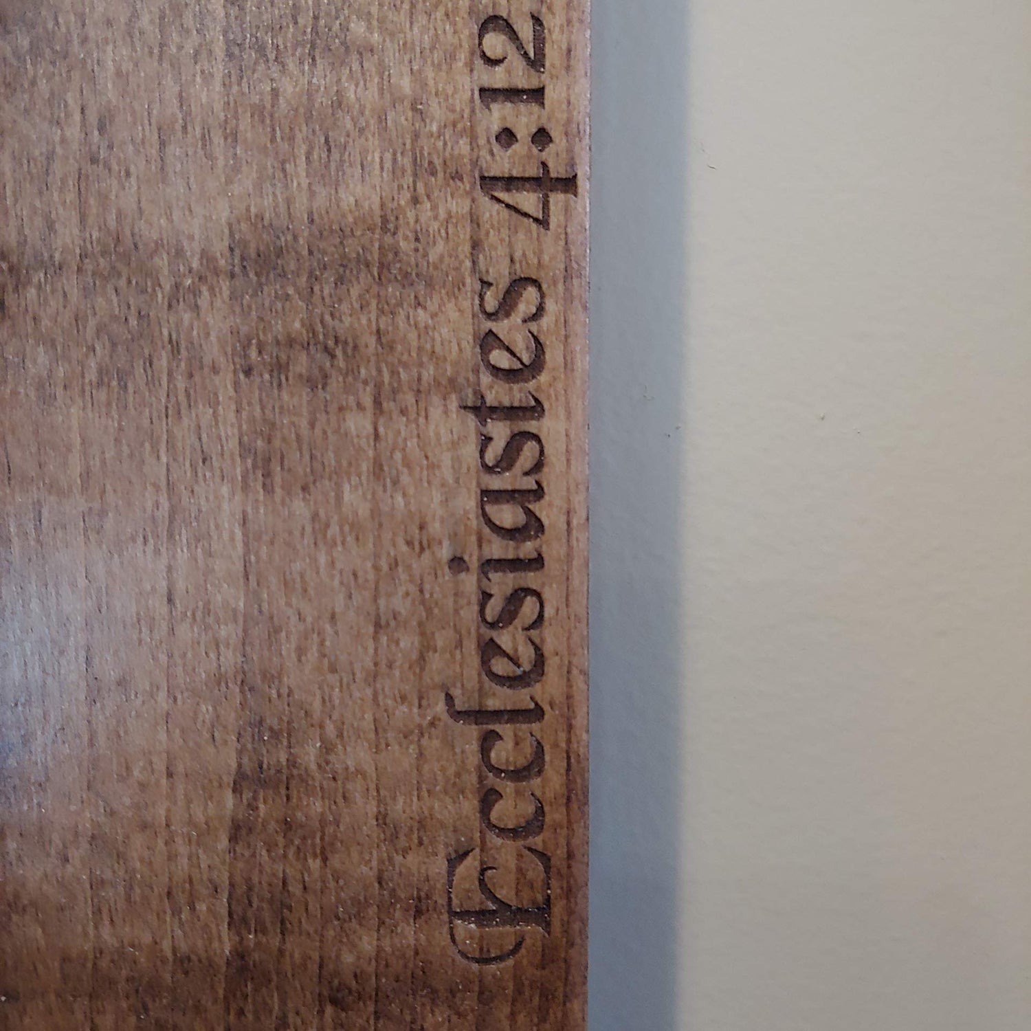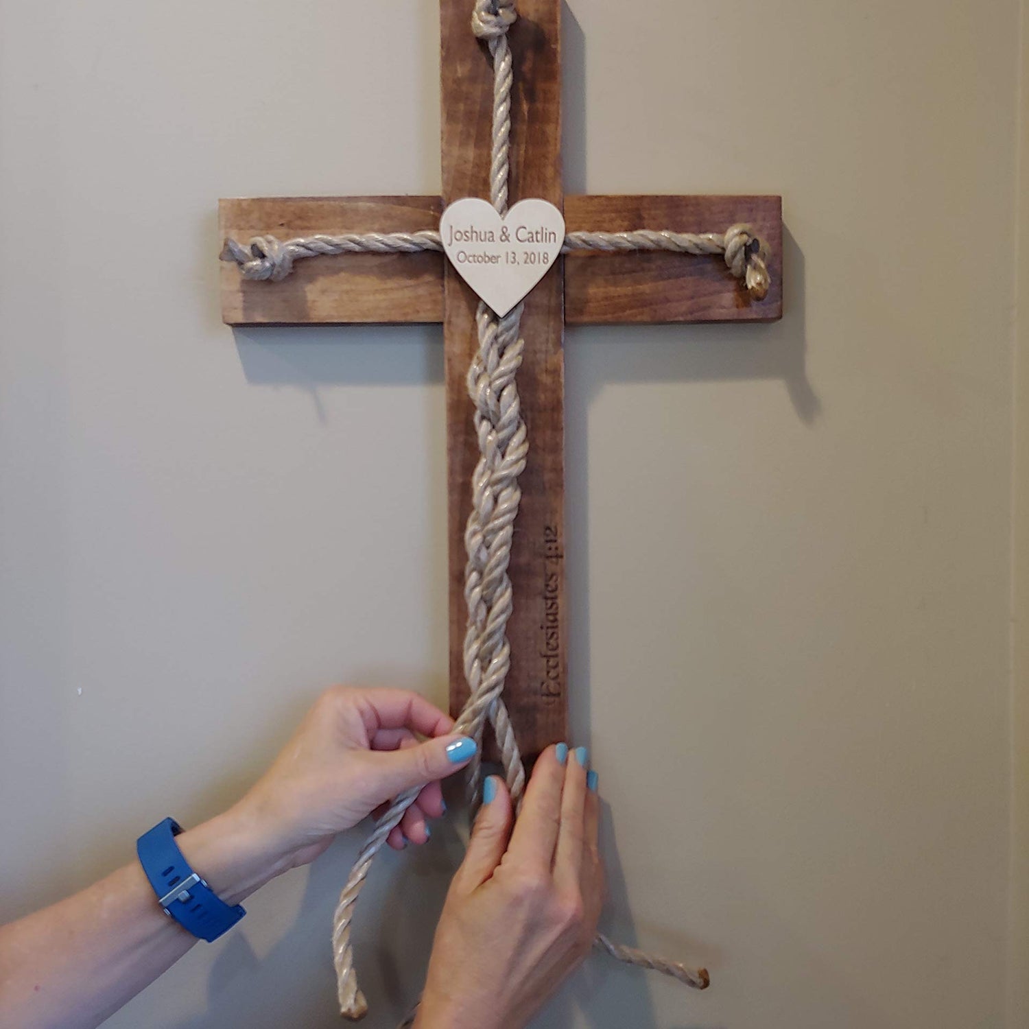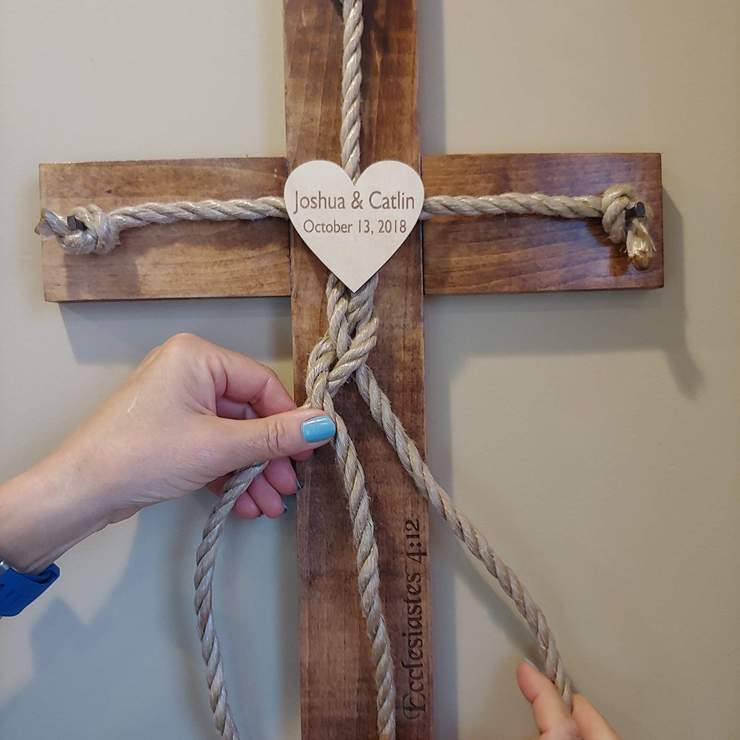 Details: This is a beautifully detailed and personalized, laser engraved Wedding Rope Wood Cross with Ecclesiastes 4:12 engraved up the side. Hand-forged, blackened nails are used to tack the twisted rope to the cross. Each cross is a beautiful artistic handcrafted work of art using the finest maple with special attention to every detail. Once the cross is cut, assembled and engraved it is hand sanded multiple times, stained then clear coated. Include names, date and font selection to be engraved in the laser cut out heart and we will send a graphic proof for you to approve prior to production.