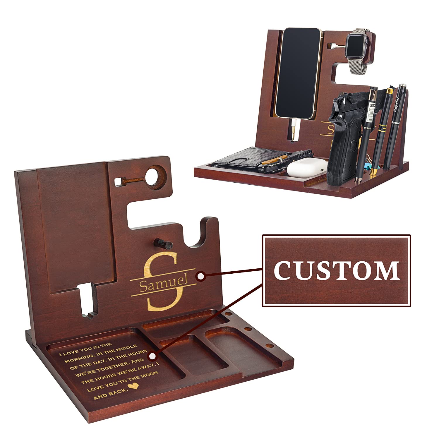 - PERFECT GIFT FOR GUN OWNERS: Conveying love, showing concern, is a good choice for gifts. The content engraved on the wooden organizers for men with gun holder allows users to be very happy every time they see it. Love is connected to each other's feelings through our wooden gun docking station. Gifts for men. Surprise your Husband, Dad, Son, Boyfriend, Brother, your friend, Police Officer, co-worker or Boss. Best gift for Christmas, Birthday, Father’s day, Anniversary, Graduation.