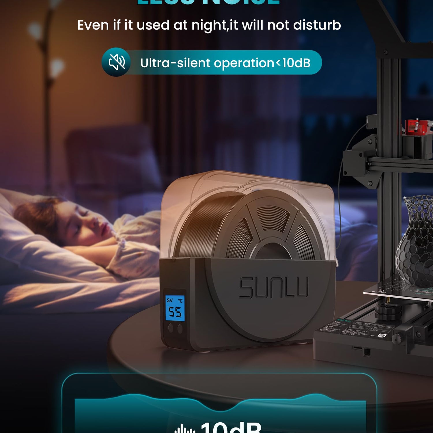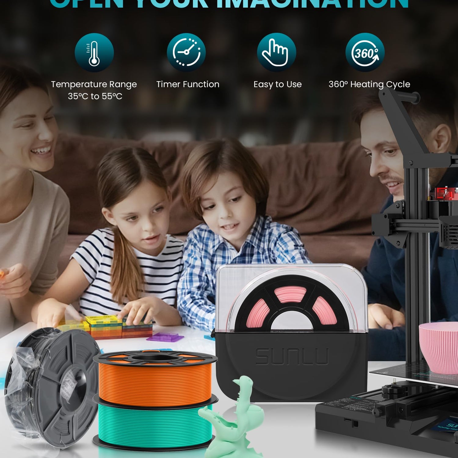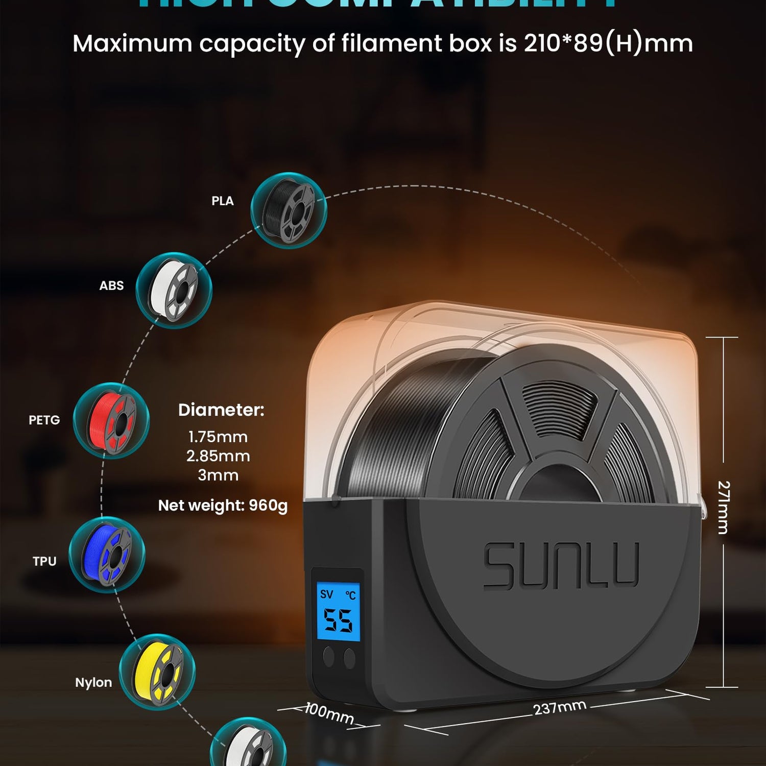 - [FAST DRYING WITH FAN] SUNLU 3D printer filament dry box can help you solve the problem of stringing, clogging and poor adhesion caused by wet filament.Upgraded filament dryer adds a fan design,speeding up the discharge of excess water from 3D printer filaments and reducing the impact of wet weather on 3D filament printing.