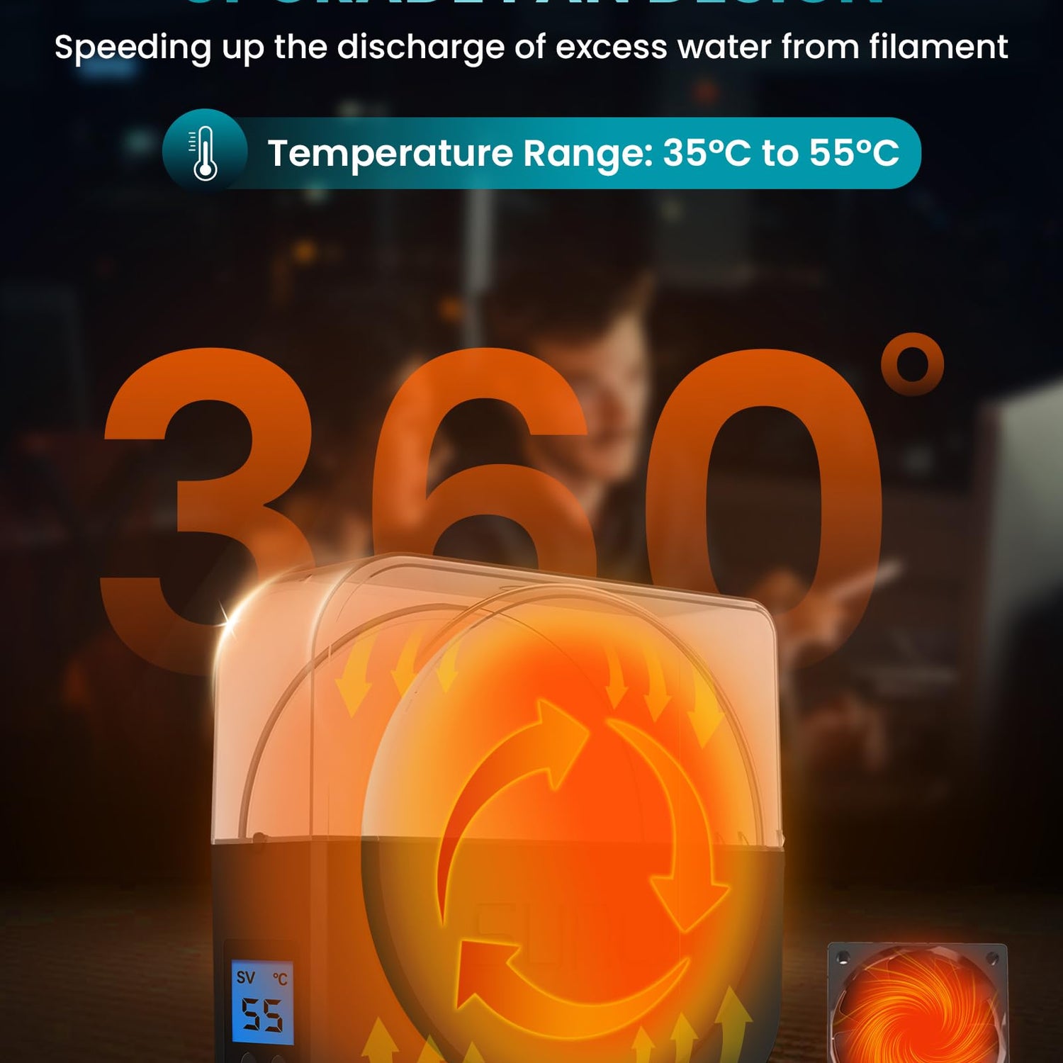 - [PERSONALIZED SETTINGS] You can adjust the temperature and time of 3d filament dryer according to different filament and environment.Adjustable temperature range is 35℃-55℃.After using the drying box, the print quality is better,surface smoother,good layer adhesion.