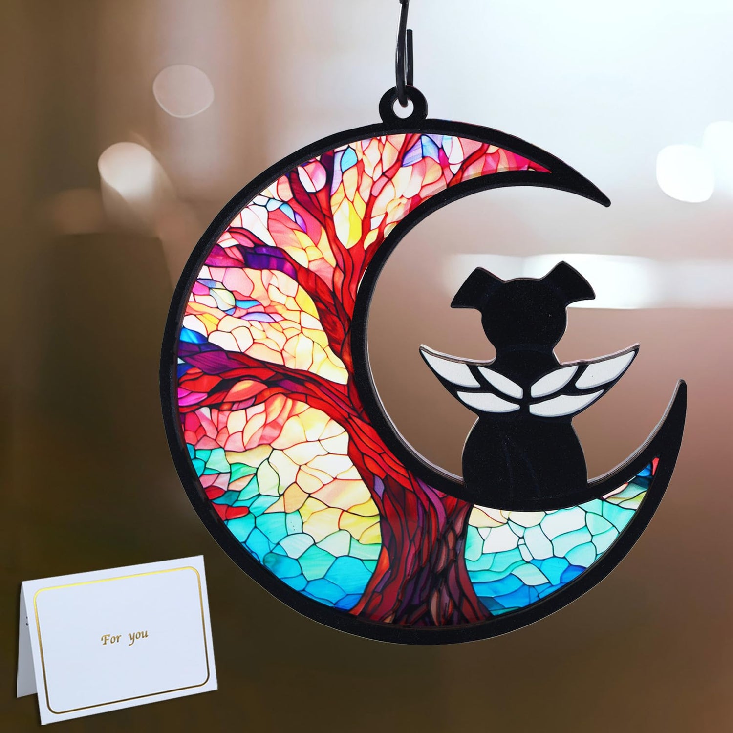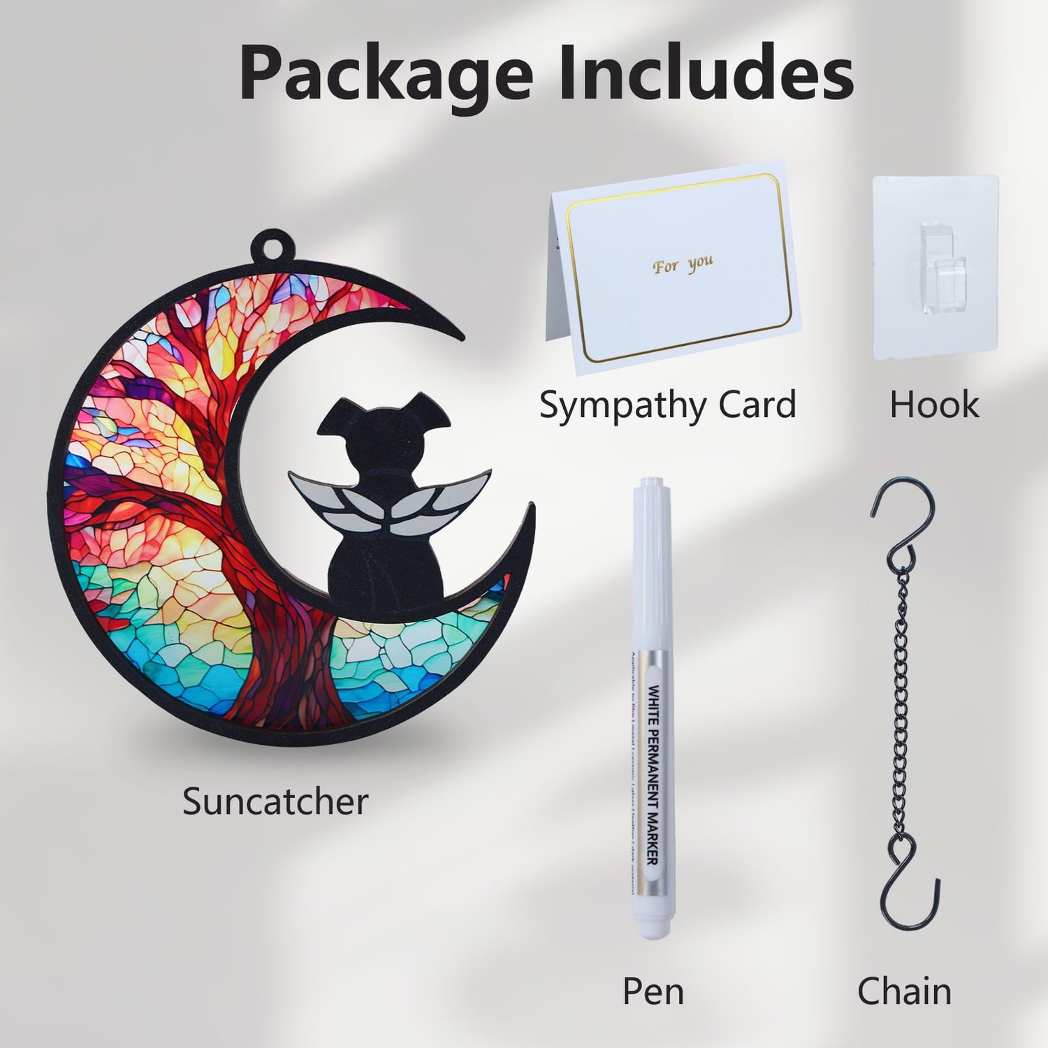 - What’s Included: --1 Suncatcher,1 chain,1 hook,1 pen,1 card (with rainbow bridge poem for loss of dog) 《Sealing Label Pattern Random》