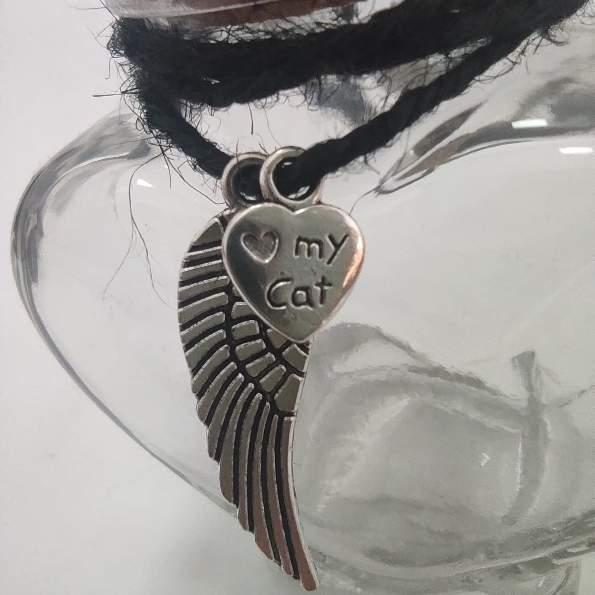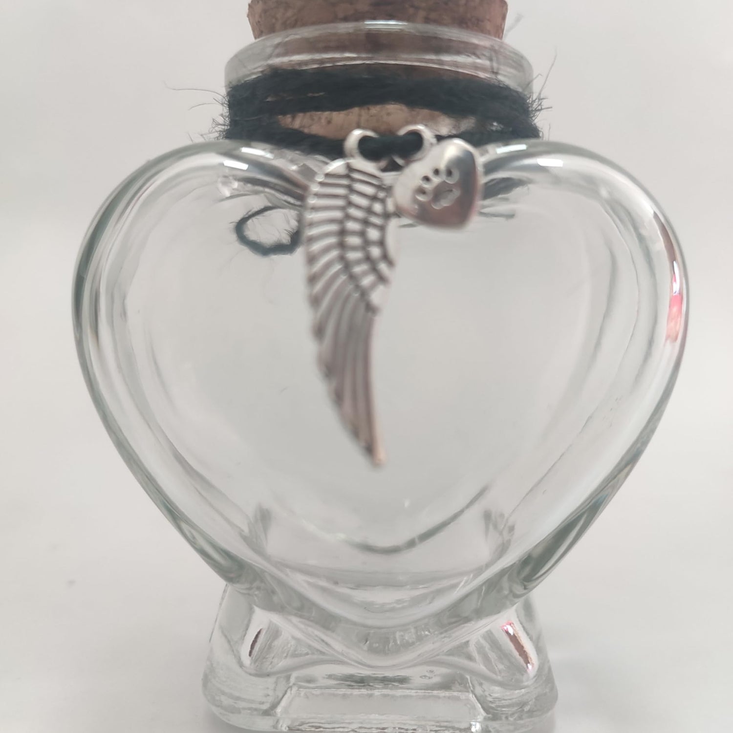 - Glass bottle with cork top, metal charms, and a hemp string bow. Perfect for a memorial of your beloved pet