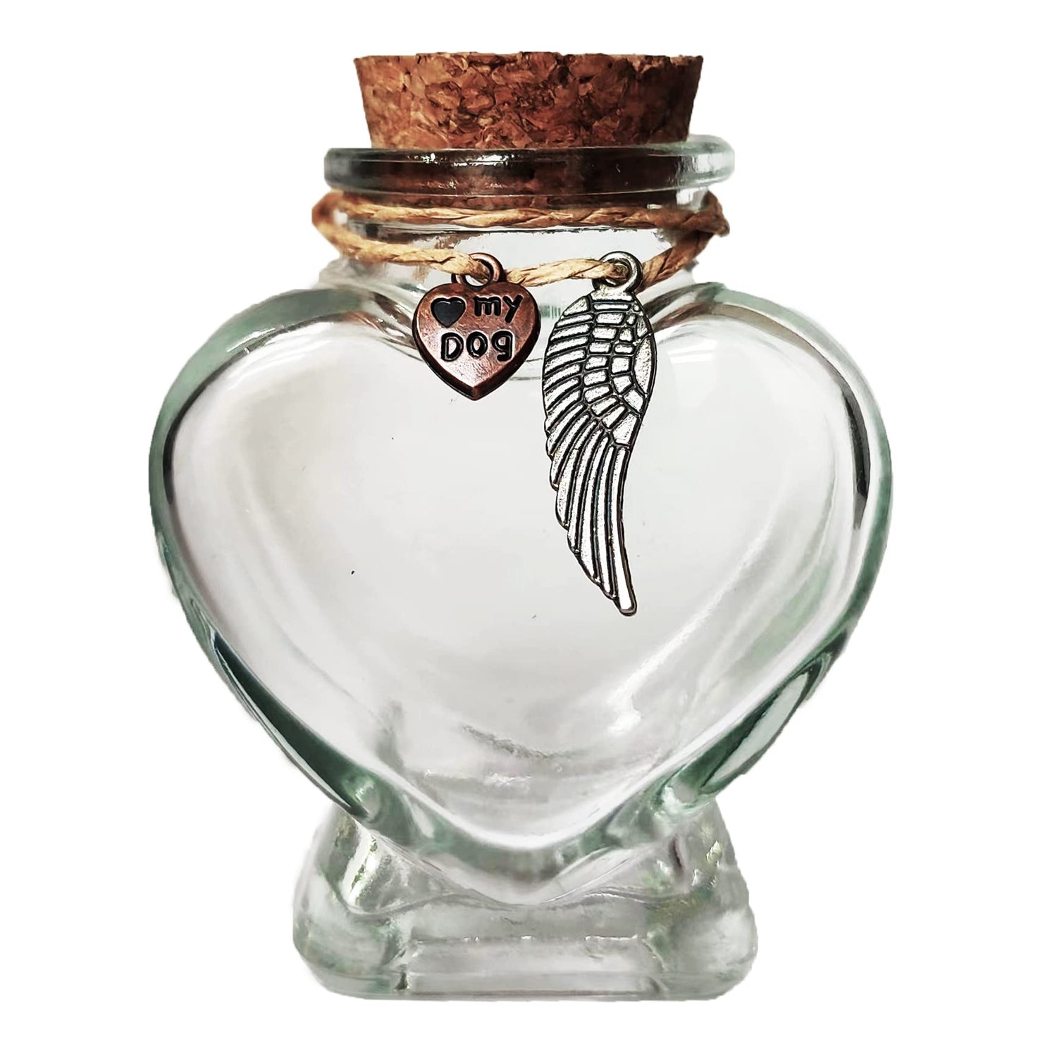- Glass bottle with cork top, metal charms, and a hemp string bow. Perfect for a memorial of your beloved pet
