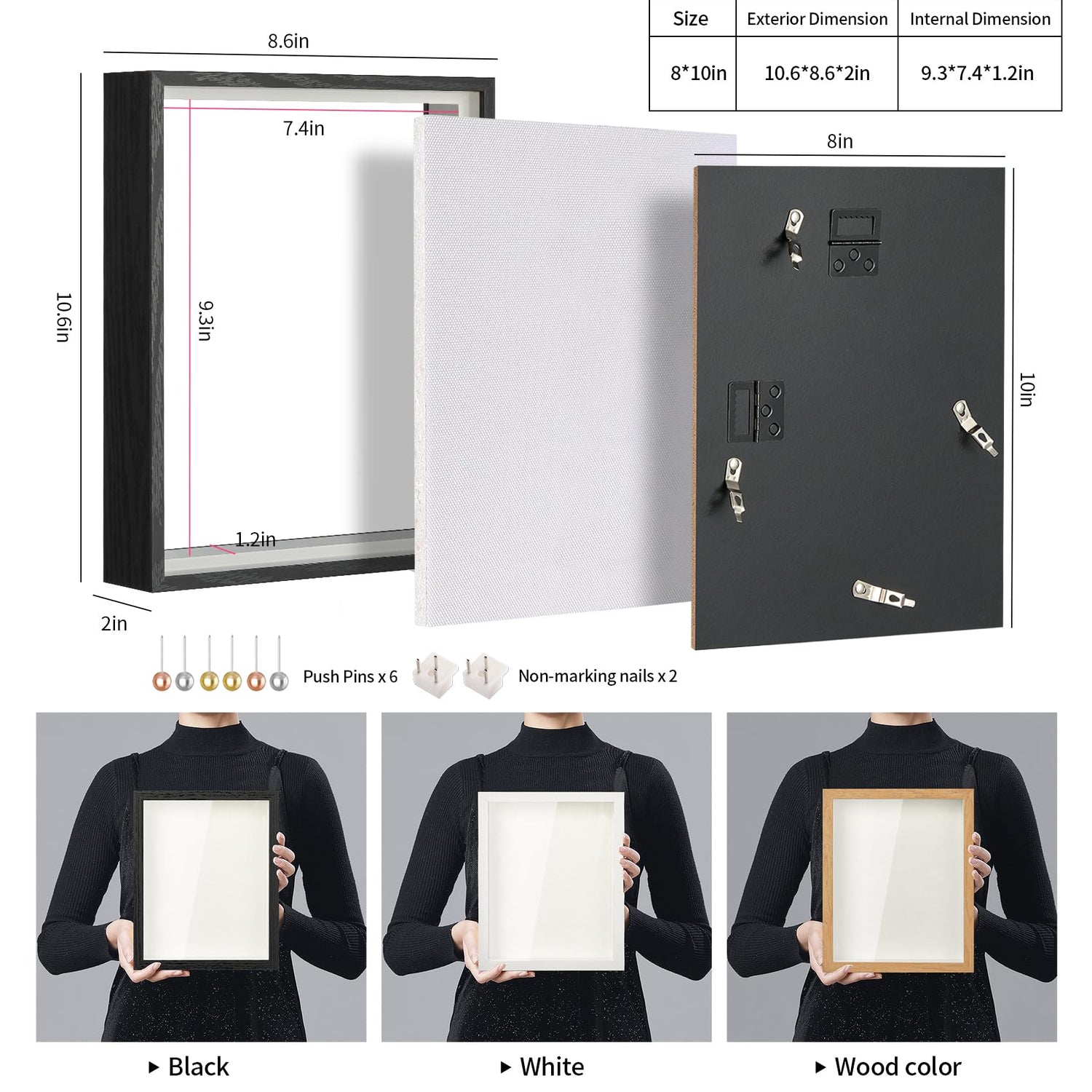 - 【Shadow Box Size】This 8×10 in black shadow box frame (includes 2 non-marking studs + 6 decorative pins) measures 8.7×10.7 inches on the outside and 2 inches in depth on the outside. The internal display size is 7.55×9.65 inches with an internal depth of 1.2 inches