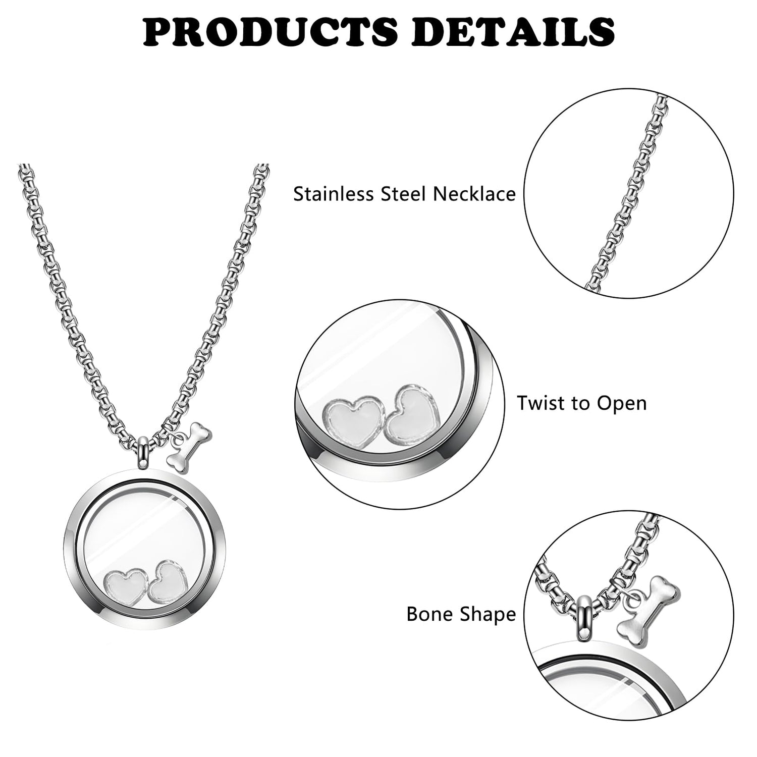 • 【Quality Material】The heart necklace is made of good-quality stainless steel and high-definition glass. The product is not easily damaged and can be used for a long time. This memorial necklace includes 1 stainless steel necklace, 1 bone-shaped pendant, 1 storage glass box, 1 heart-shaped ornament, and 1 ornament box. The souvenir necklace can be used to store the pet's ashes or hair to preserve the memory.