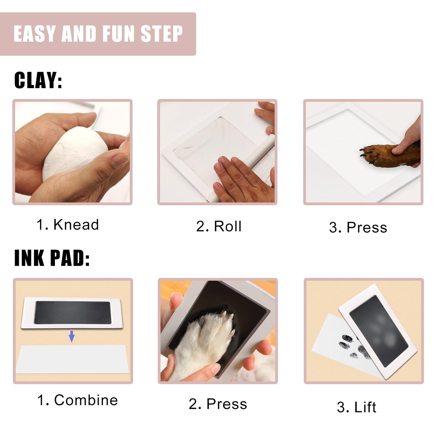 - Quick & Safe: Roll out a safe and non-toxic clay and press it on your pet's paw prints.After drying, the clay has a hard texture and can clearly print your pet's precious paw prints.The oversized clean touch ink pad in the pet paw impression kit is 100% safe, non-toxic and easy to use for pets.The pet's paws won't even touch the ink, and it won't stain the pet!Oversized ink pads so you don't have to worry about your pet's paw fitting.