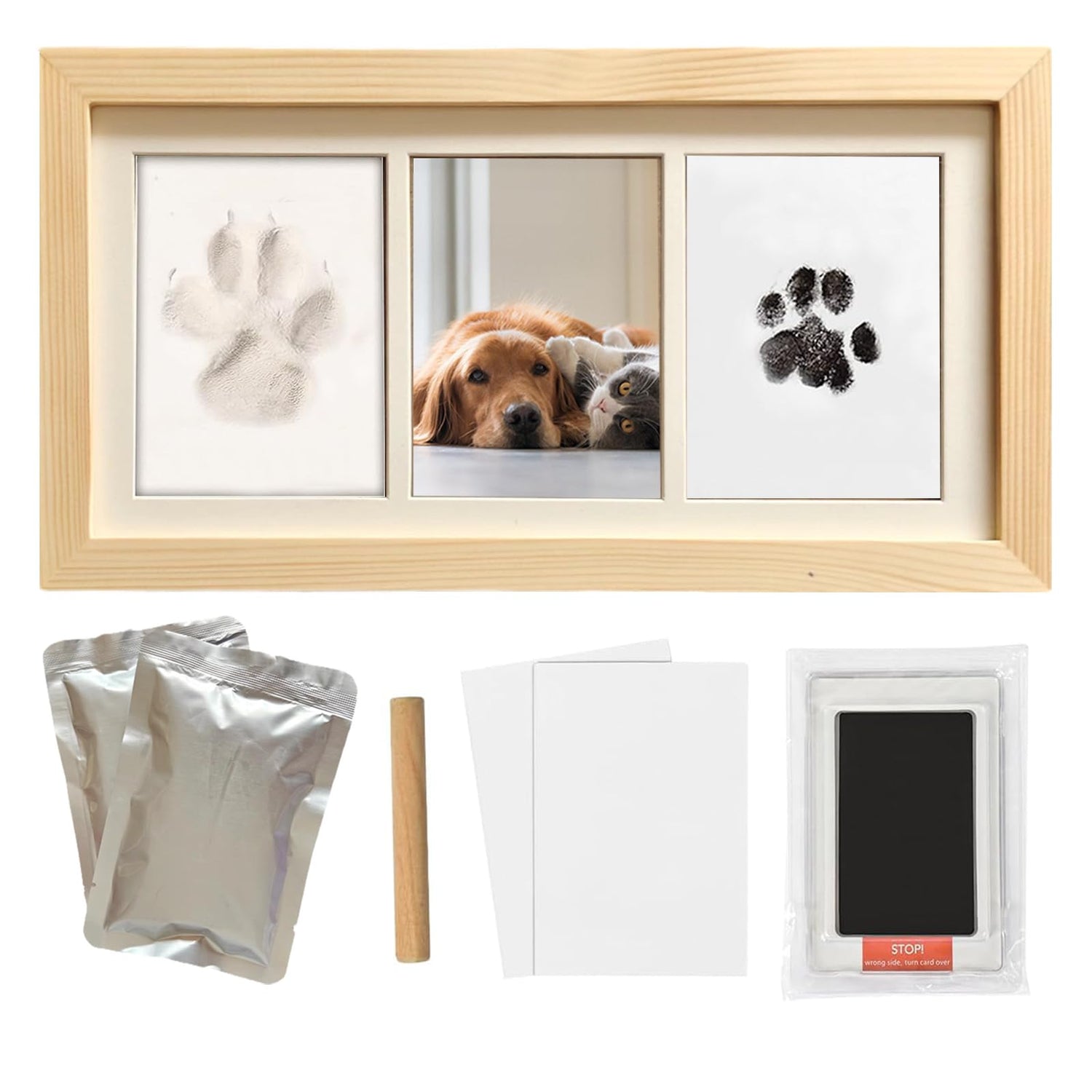 - Pet Paw Print Impression Kit: Our dog memorial picture frame is a natural wood photo frame with an outer frame size of 13in x6.8in, which can hold 3 photos.Impression pawprint clay & Clean touch ink pad is displayed together simultaneously.Ideal for home, villa or office as a personalized desktop decoration.Create a paw-print picture frame with your pet to leave your precious memories in a memorial album.