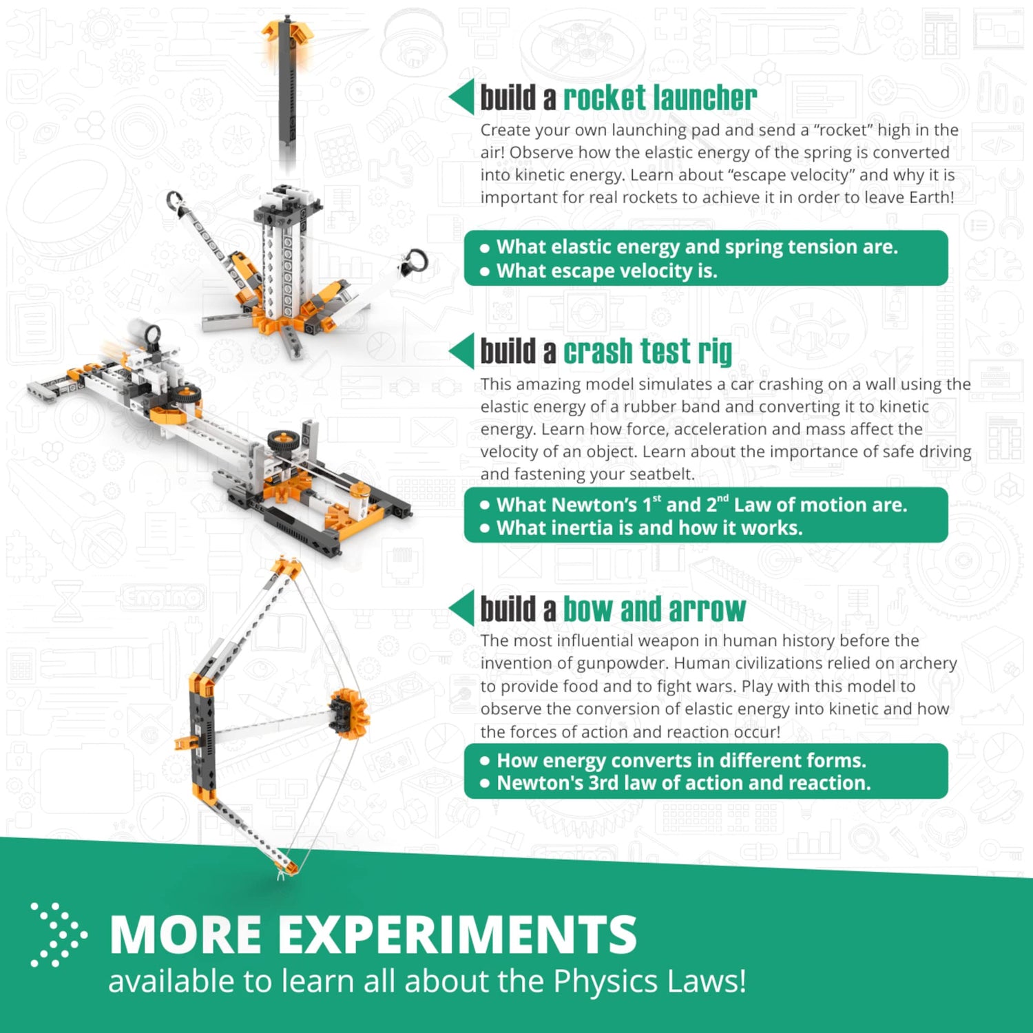 - BUILD 6 incredible working models, including a rocket launcher, a crash test rig, a sharpening wheel and more. Get ready for a physics adventure with this STEM Project.
