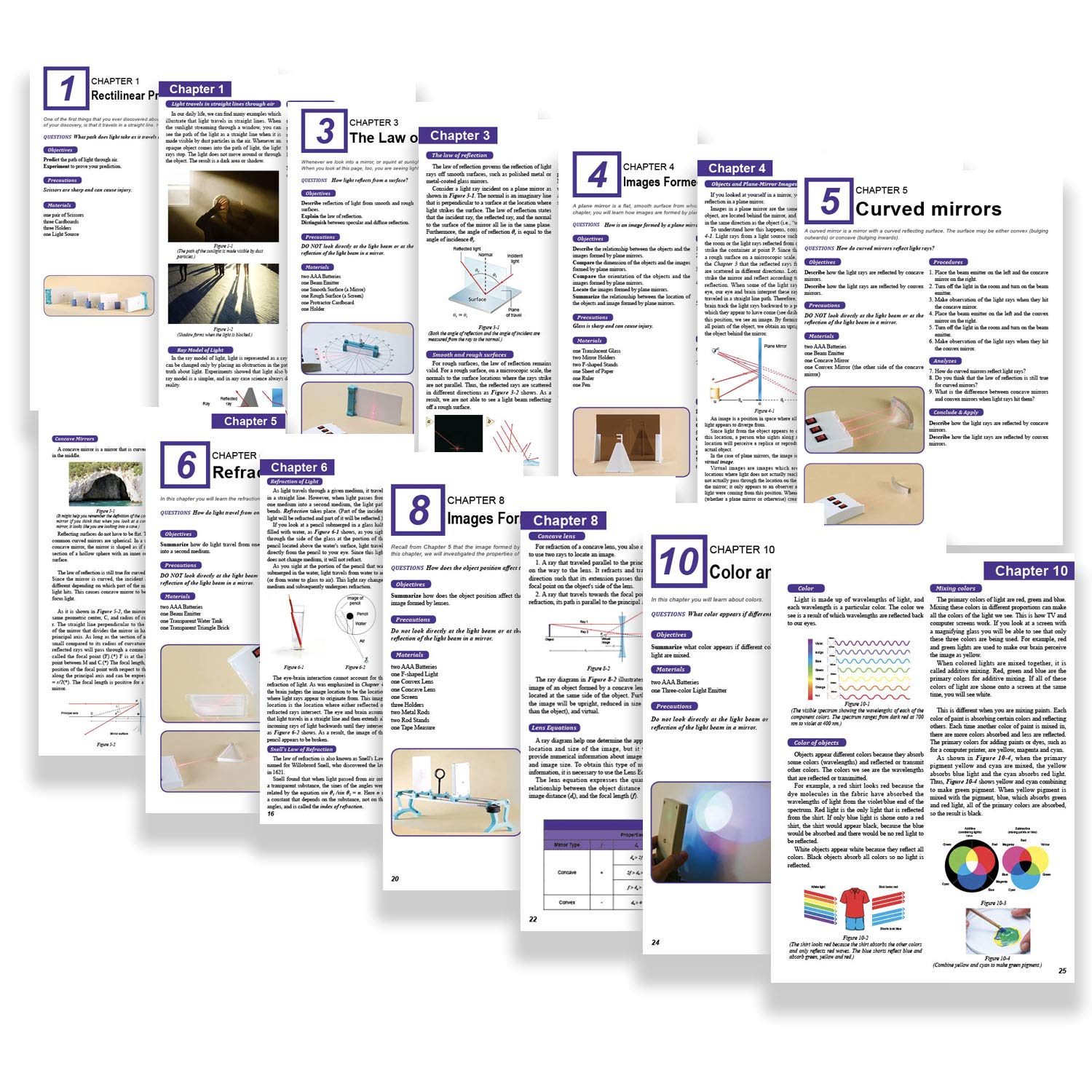 - 15+ OPTICS SCIENCE EXPERIMENTS FOR KIDS: Learn about how lights travel, reflect, refract and investigate optics by doing experiments with 25 Items including 32-pages full-color manual