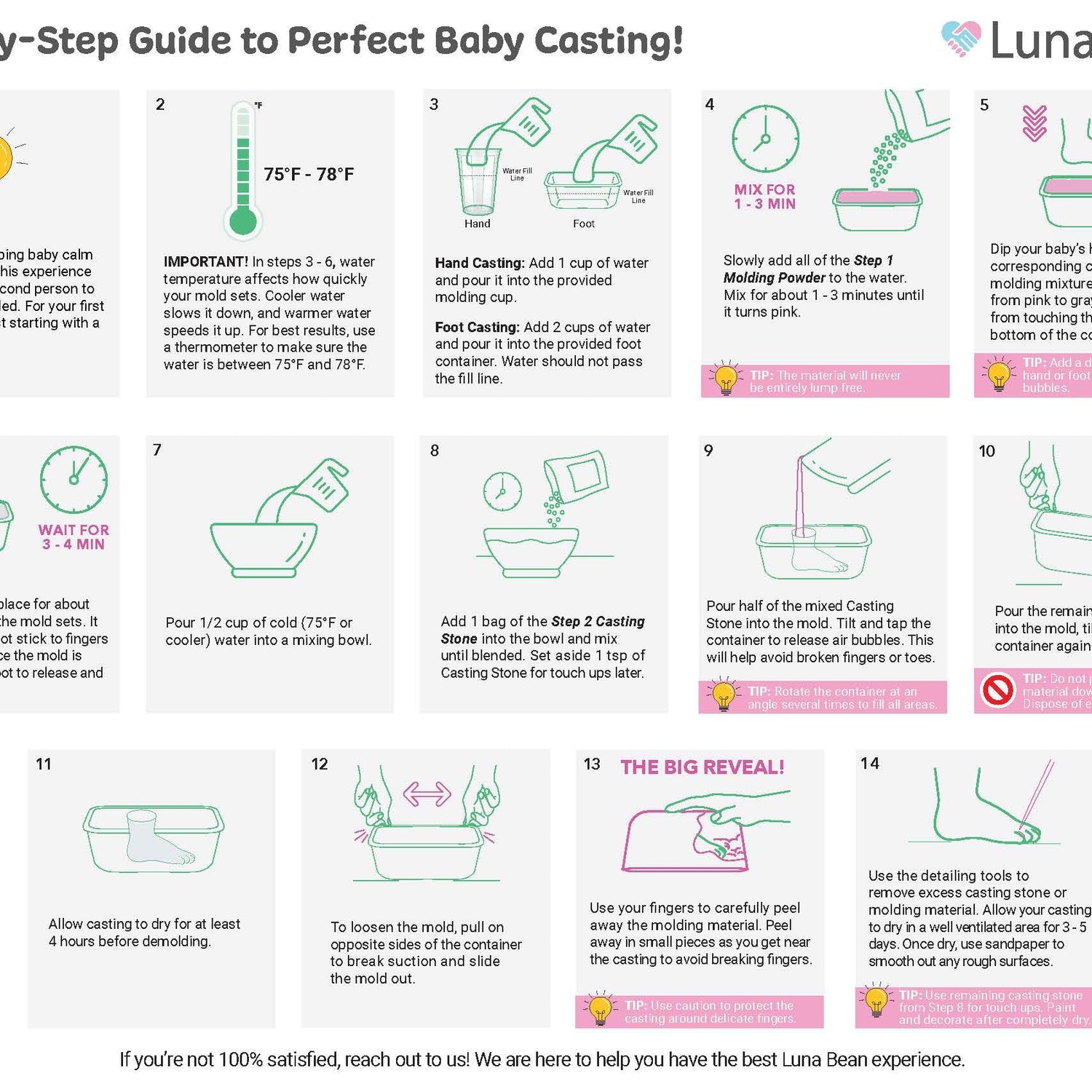 • Easy DIY Baby Handprint Kit - Just mix, mold, cast, and peel away. Our baby footprint kit comes with clear, easy-to-follow instructions. If your cast doesn’t come out perfect, just send us a photo—we’re here to help you get it right.