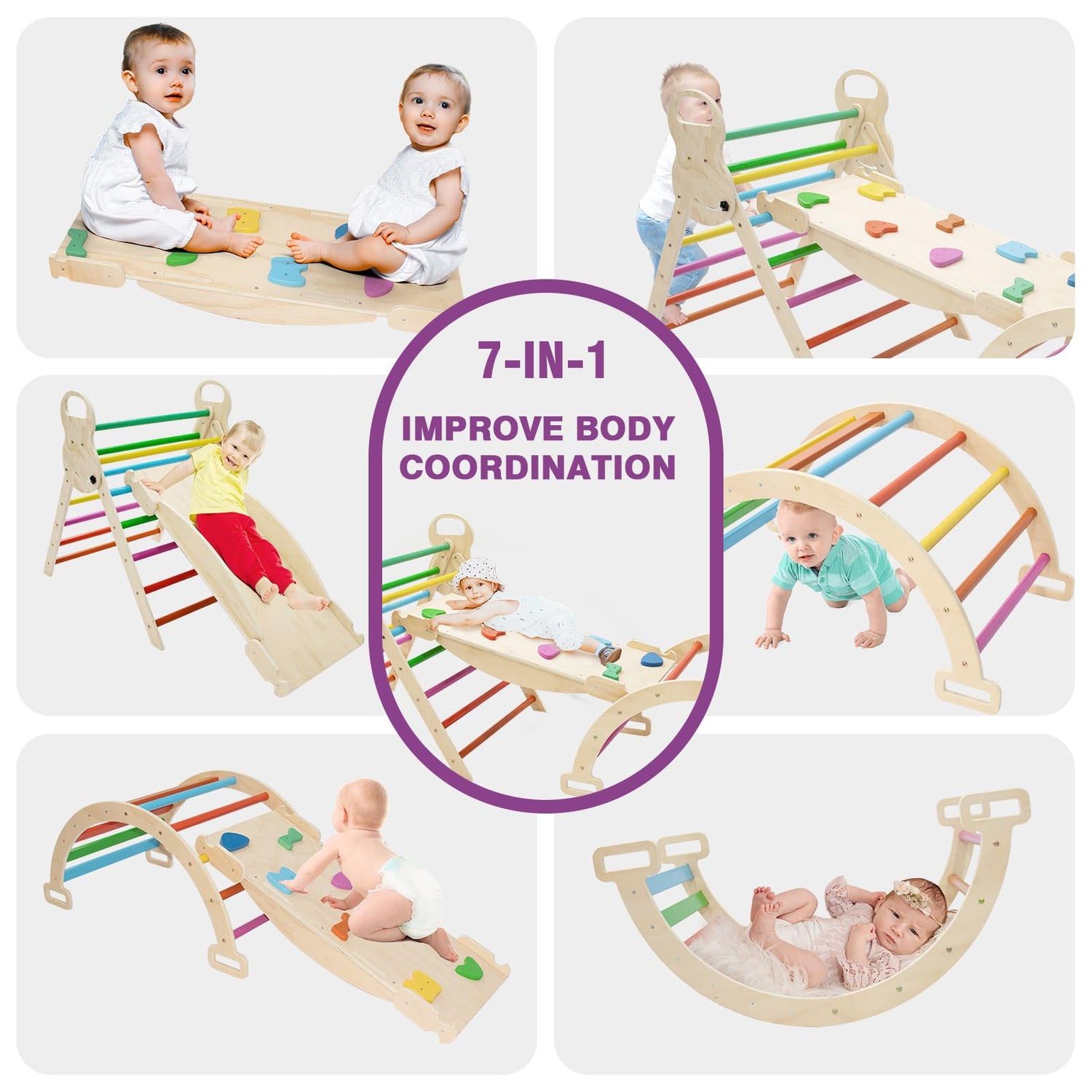 - Colorful and Safe: Bright rainbow colors not only attract children's attention, but also stimulate their imagination and creativity. Children can weave their own wonderful stories and enjoy endless hours of fun in this colourful play world.The climbing arch uses slats instead of rounded wooden sticks.Double-sided Reversible Ramp added safety handrails to prevent children from falling