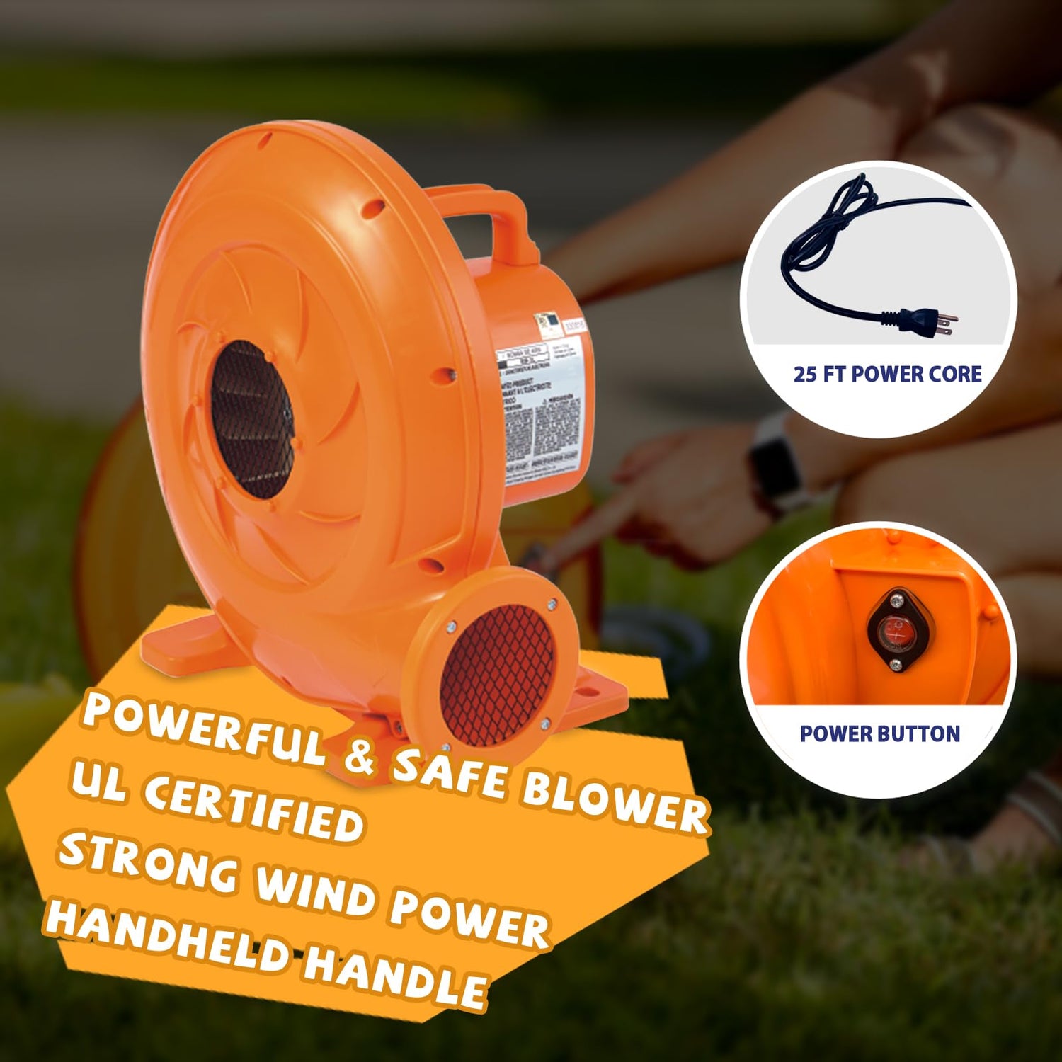 - Air Blower Included: Our bounce house includes heavy duty air blower. Water cover button and plug keep you and your kids safe while having fun. Air blower also comes with 25ft long power cord and handheld handle. Powerful and safe blower for bounce house with more fun.