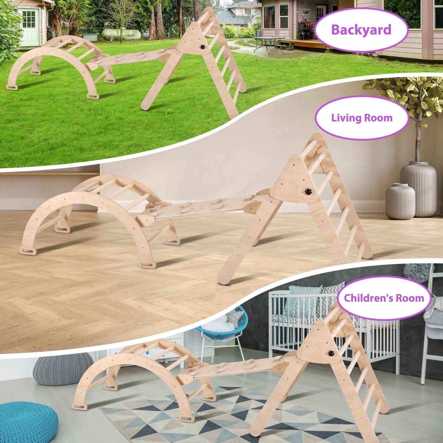 Agiyimi 4 in 1 Pikler Triangle Climber, Foldable Wooden Triangle Ladder Montessori Climbing Toys with Ramp Arch Climber Rocker Indoor Outdoor Gym Playground Climbing Toys for Toddlers(Natural)