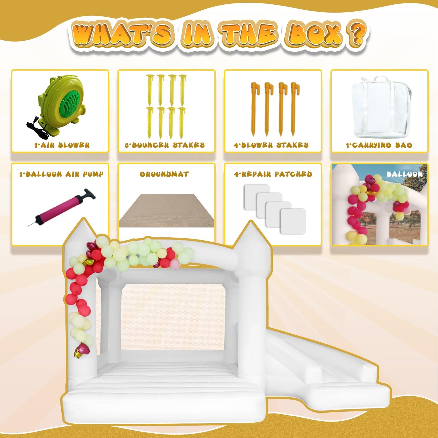 - 【Perfect Equipment】Bounce House*1, Tote Bag*1, Powerful Blower*1, Inflatable Balloon Set*1, Plastic Floor Nails*8, Repair Patched*4, Air Blower*1, Bobo Balloon*20, Pattern Balloon*10, Ground Mat*1