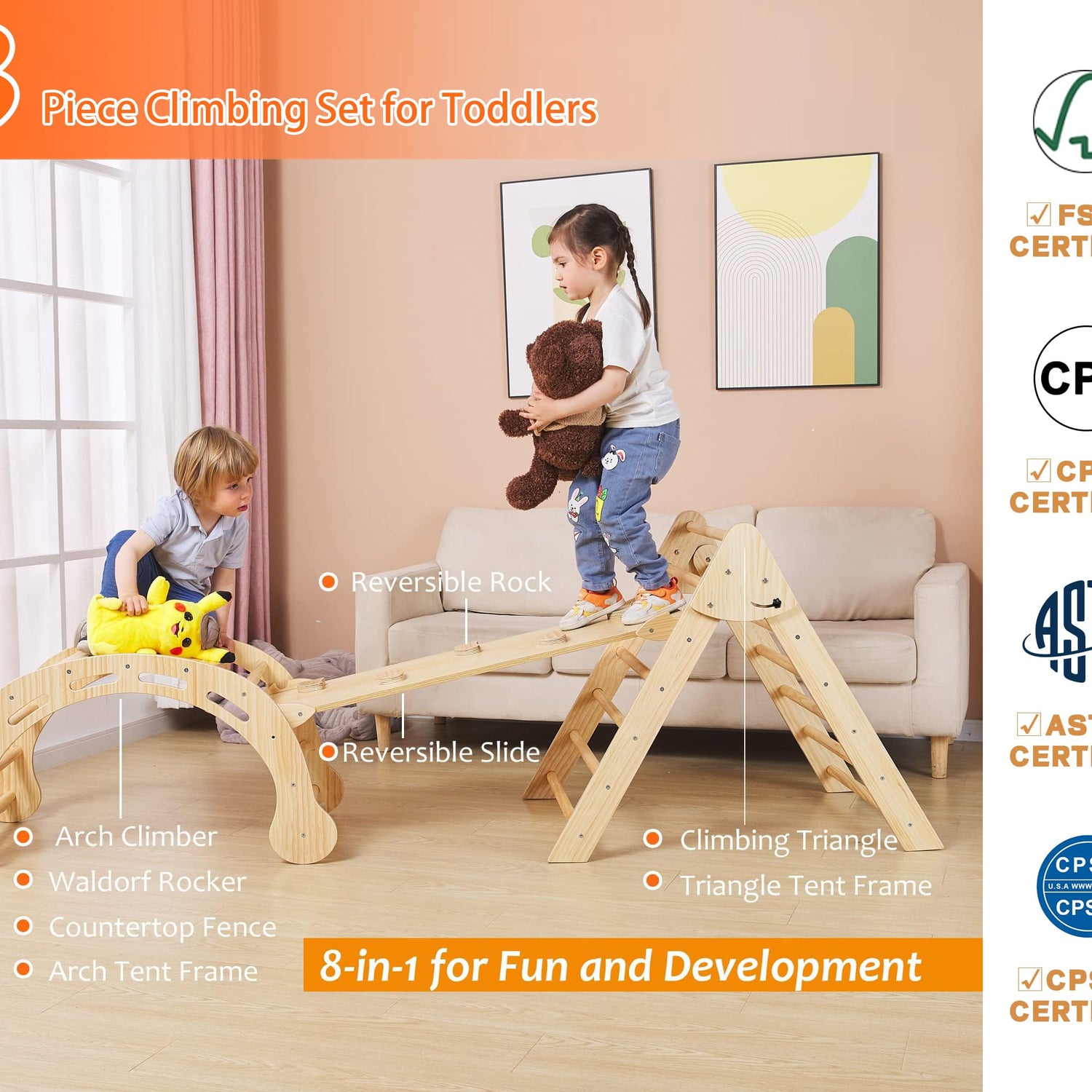 FANABAS Large 8 in 1 Pikler Triangle Set, Montessori Climbing Toys for Toddlers 1-7 Years Kids Jungle Gym Outdoor and Indoor Playground, Foldable Triangle Climber,Arch,Rocker [Big 33LB!]