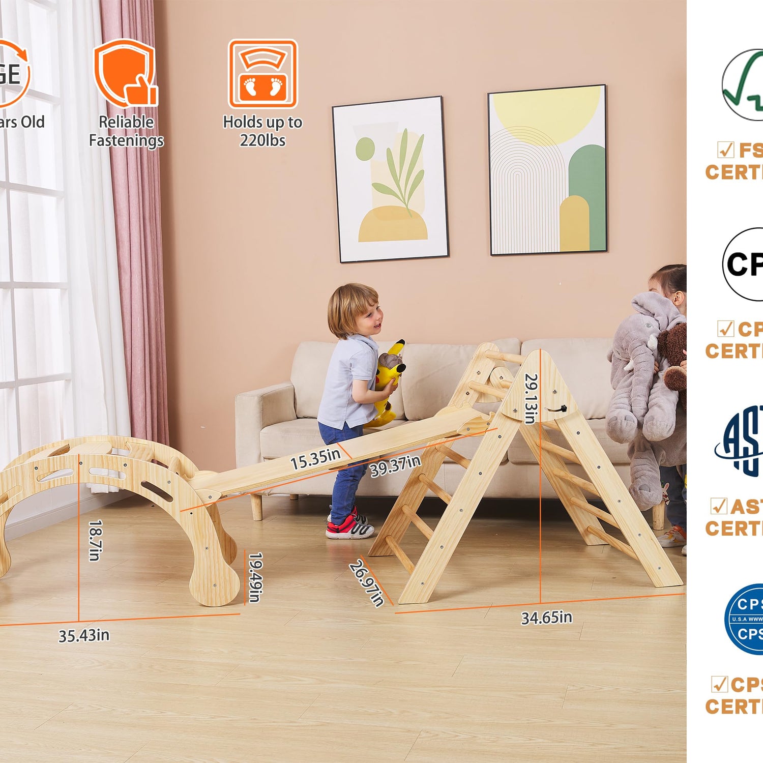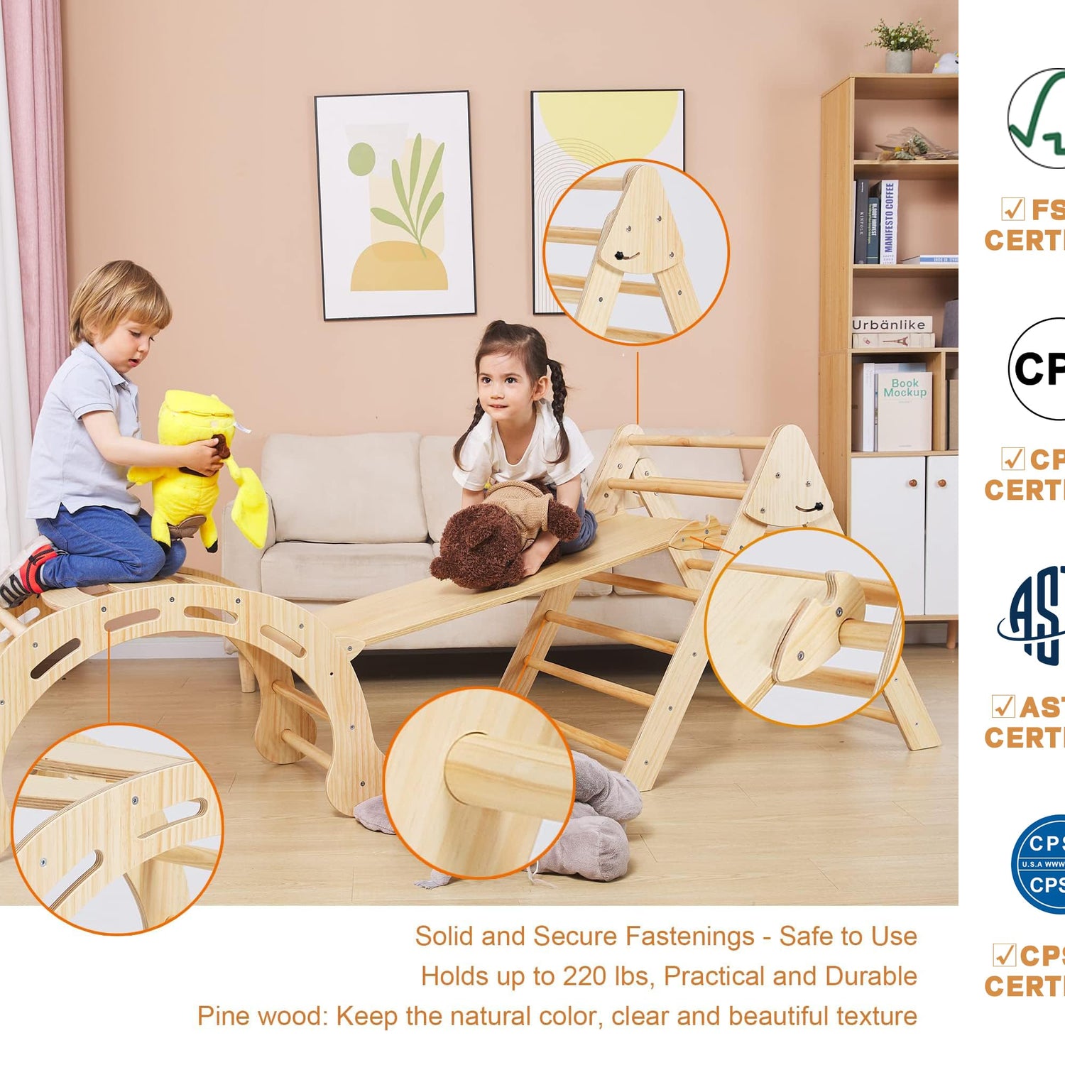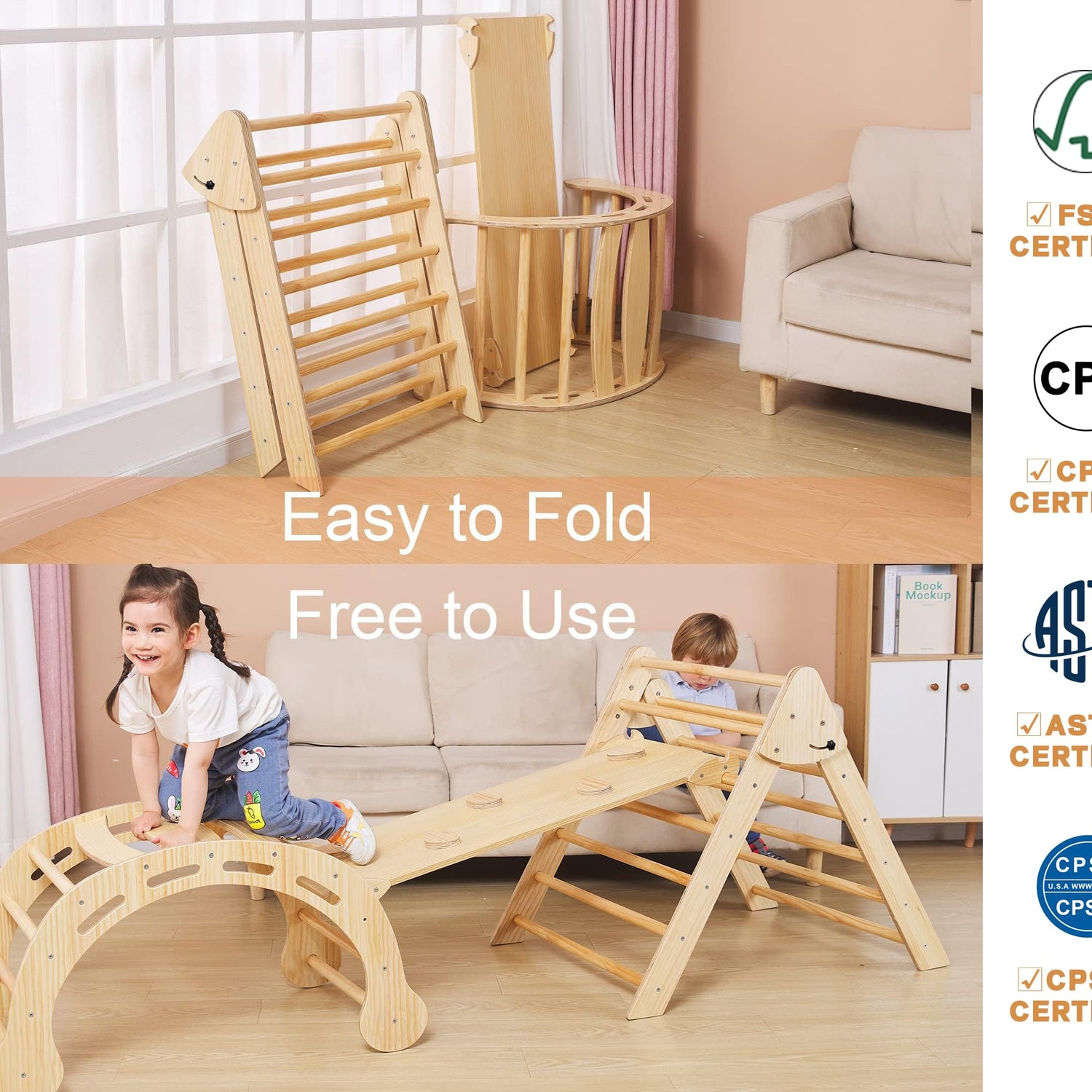 Details: FANABAS Foldable Pikler Triangle Climbing Set for Kids is a versatile and fun climbing toy designed for children aged 12 months to 6 years old.otal, but has at least 8 amazing functional play.