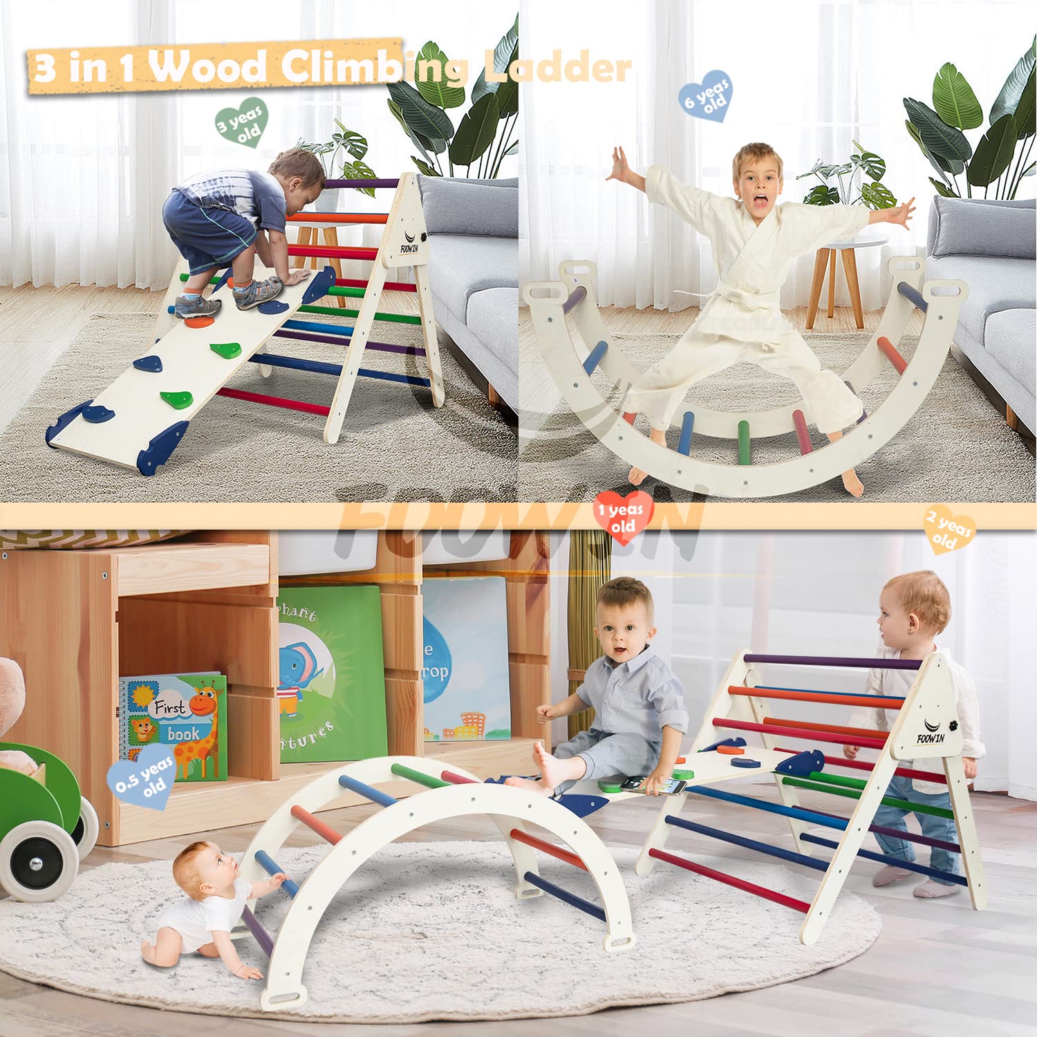 - 【Professional indoor climbing gym】 The FOOWIN Climbing triangle set is based on the Montessori method and Pikler's principle. It can effectively improve a child's motor development, agility, reaction skills, balance control and coordination.One side of the ramp is for sliding, one for climbing.The climbing arch is also a rocking toy when it's put side down According to the character of the child you can matched Climbing triangle set.
