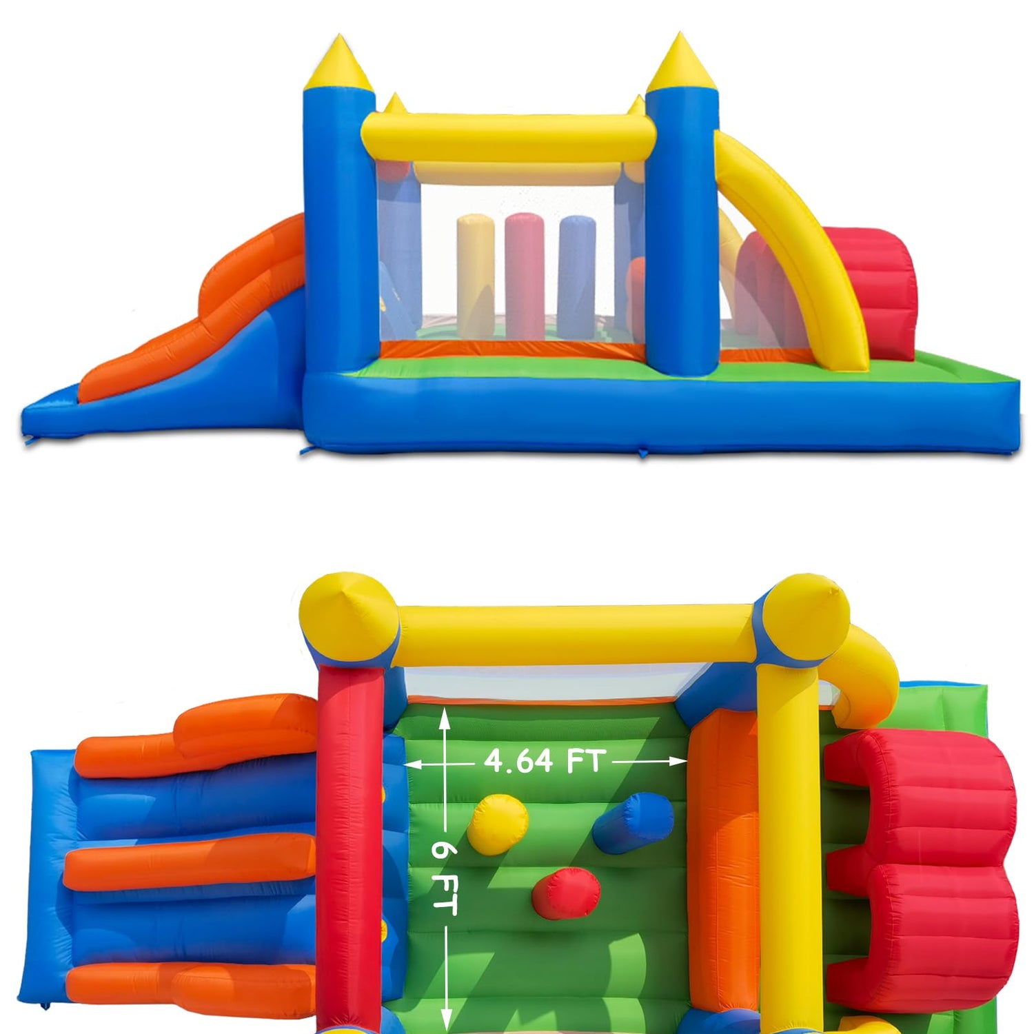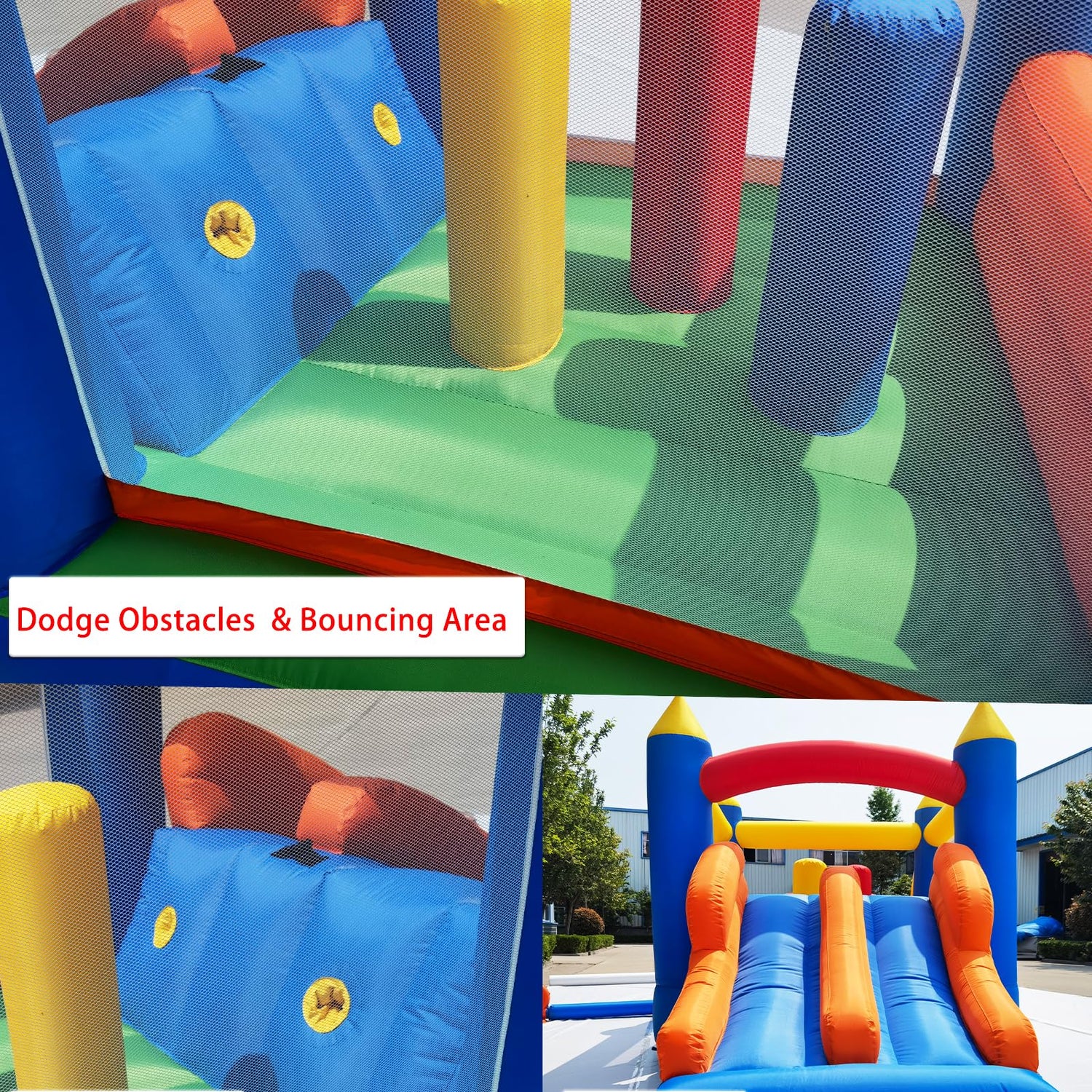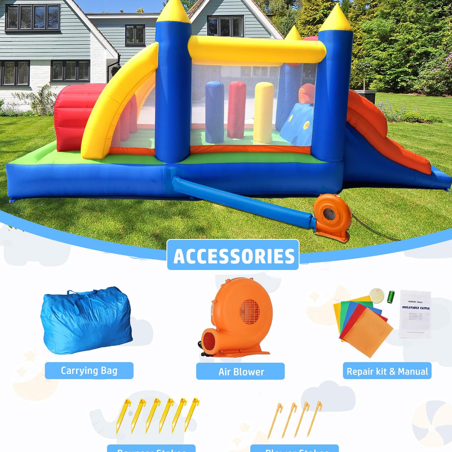 - Powerful Blower Included & Easy Setup: high quality electric air blower keeps the bounce house firmly and safely inflated. The whole slide castle can be inflated very quickly within 2 minutes. Extra 4 Stakes for blower included, so it would not overturn and overheat.