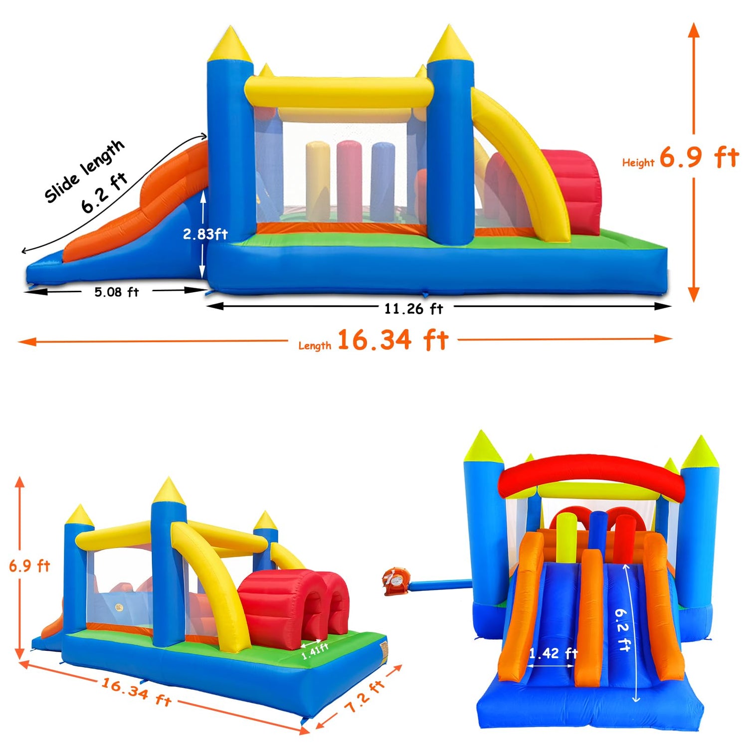 - A Variety of Interconnected Play Spaces: 2 Tunnels + Obstacles Poles & Large Trampoline + Climbing + 2 Slides ALL IN ONE. Inflated size: 16.3L x 7.2W x 6.9H Feet