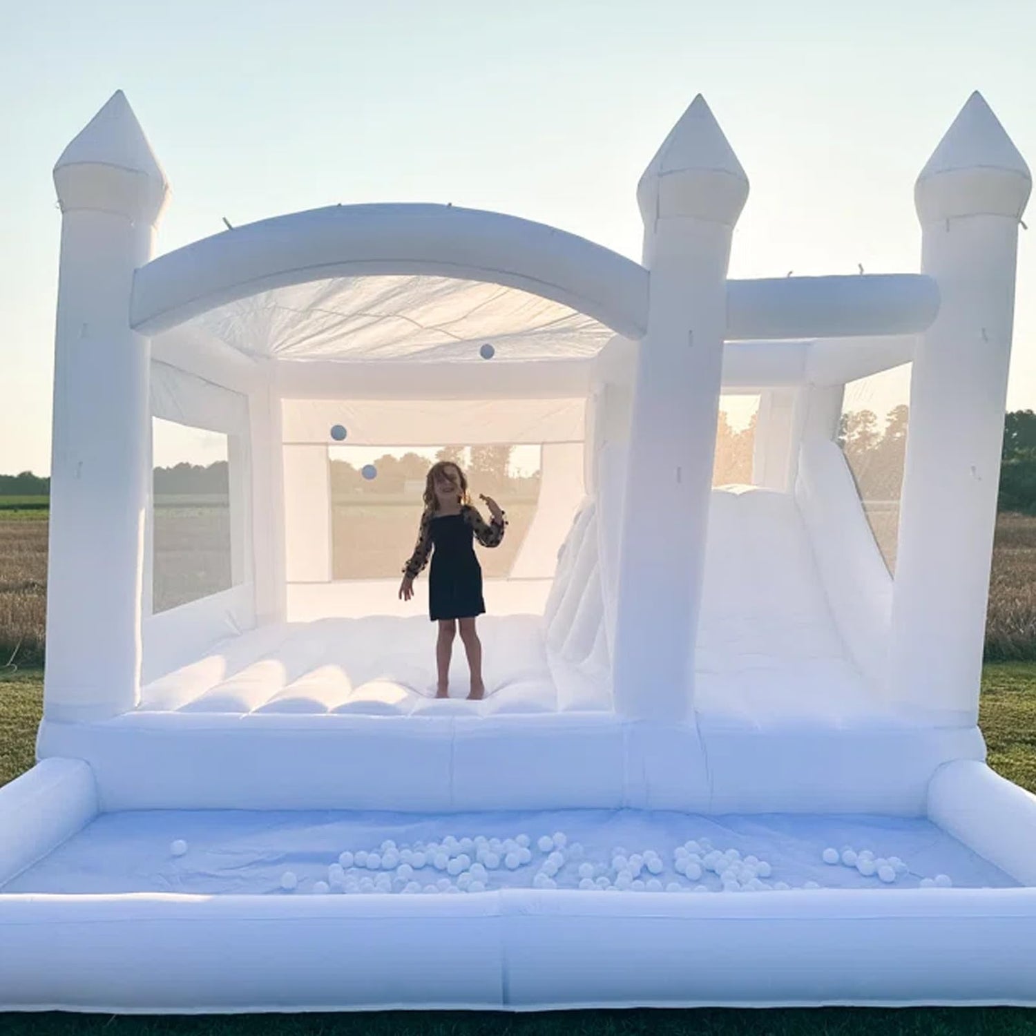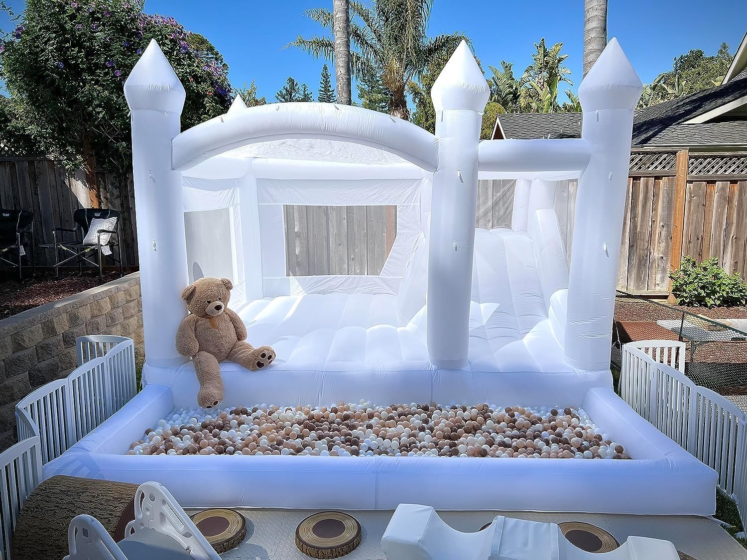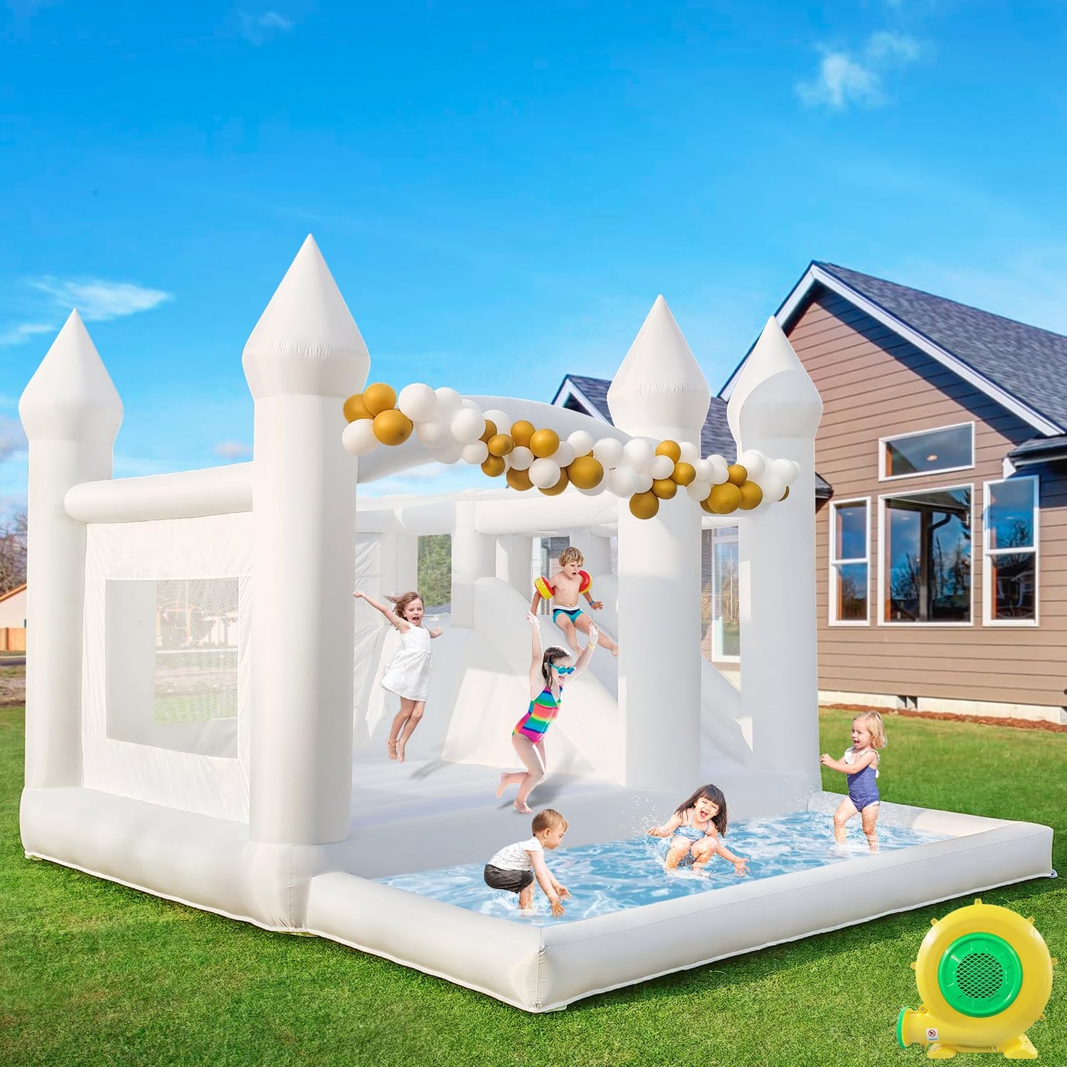 - Accessories & Clean: Our white bounce house includes a gigh quality air blower, a pack of balloon, a repair kit, and one white bounce house. We recommended to clean with a mild detergent with a soft brush and ensure that it is completely dry before storing.