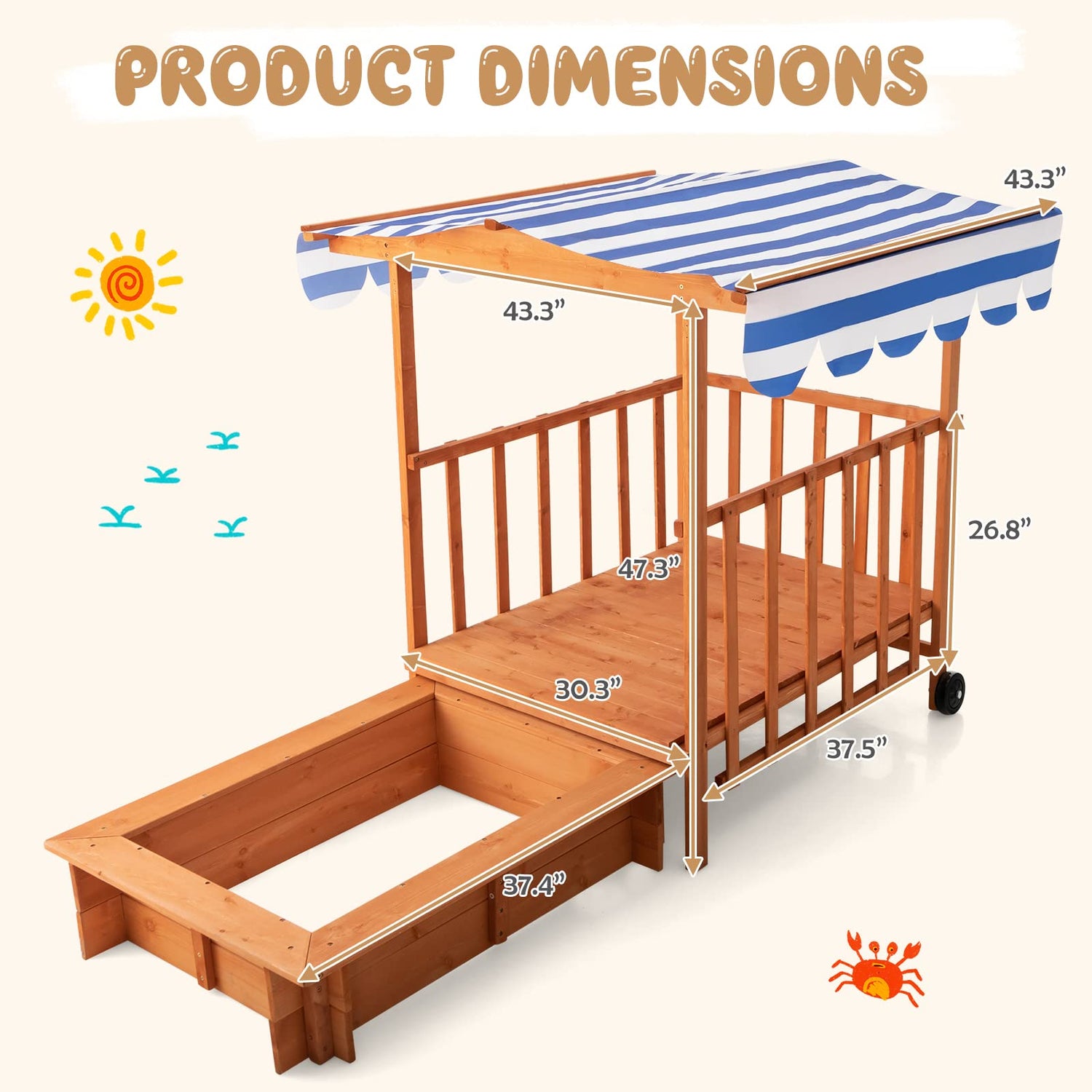 INFANS 3 in 1 Kids Sandbox with Canopy and Cover Rear Wheels Guardrails, Wooden Cedar Cabana Sandbox Playhouse for Outdoor Beach Backyard Lawn Garden Play Home Children Playset Sandpit