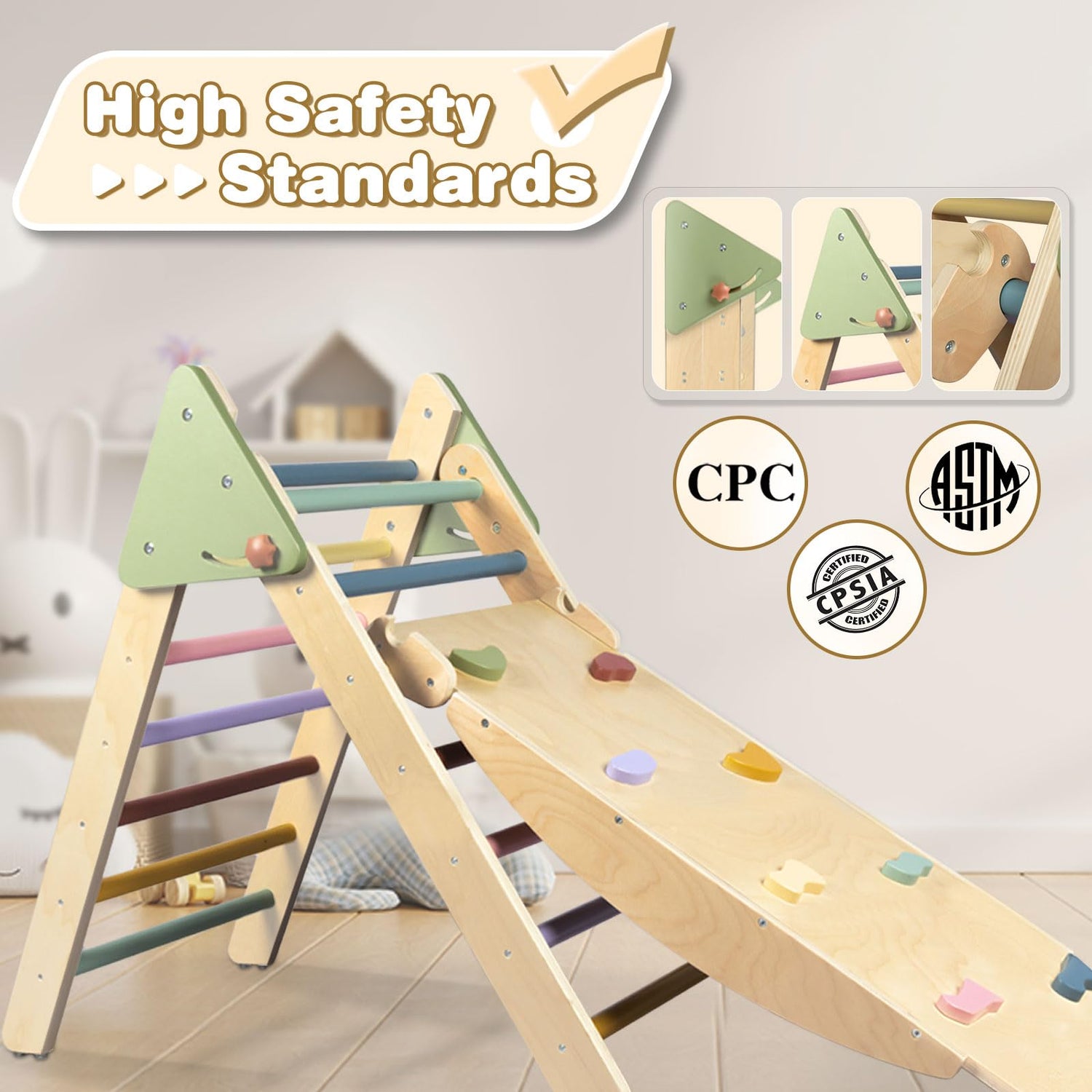 • Intimate Details: This climbing toys for toddlers 1-3 is made of high-quality wood features strength and durability. With a maximum weight of 110 lbs, it is suitable for toddlers 1-3. All wood surface is coated with water-based paint to ensure the safety of the kids. The bottoms are installed with anti-slip rubber, so even on the wooden floor or tile floor will not slip