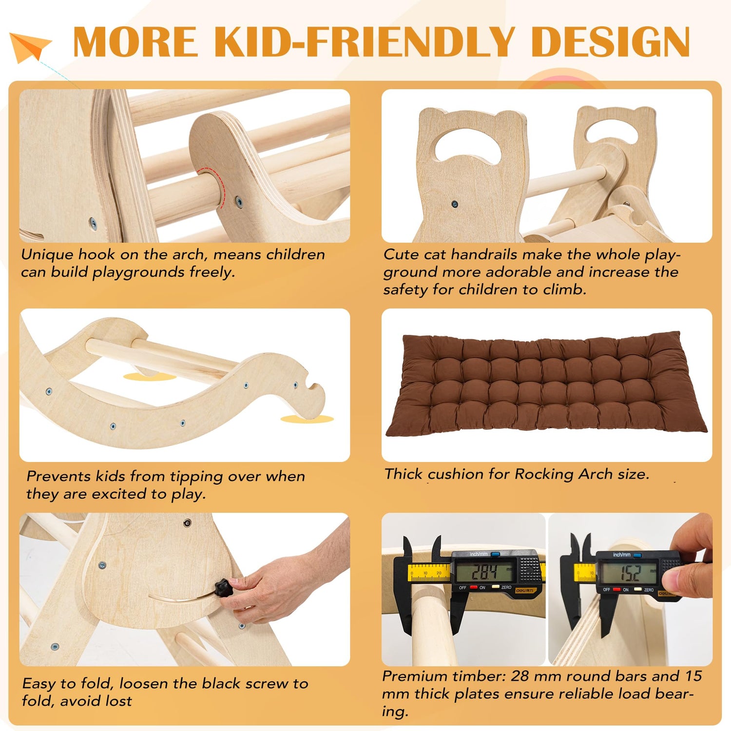 • Versatile Play Modes: The indoor jungle gym includes pikler triangle, slide, arch and arch cushion, the slide board is designed with two sides, which can be used as a climbing board and slide board