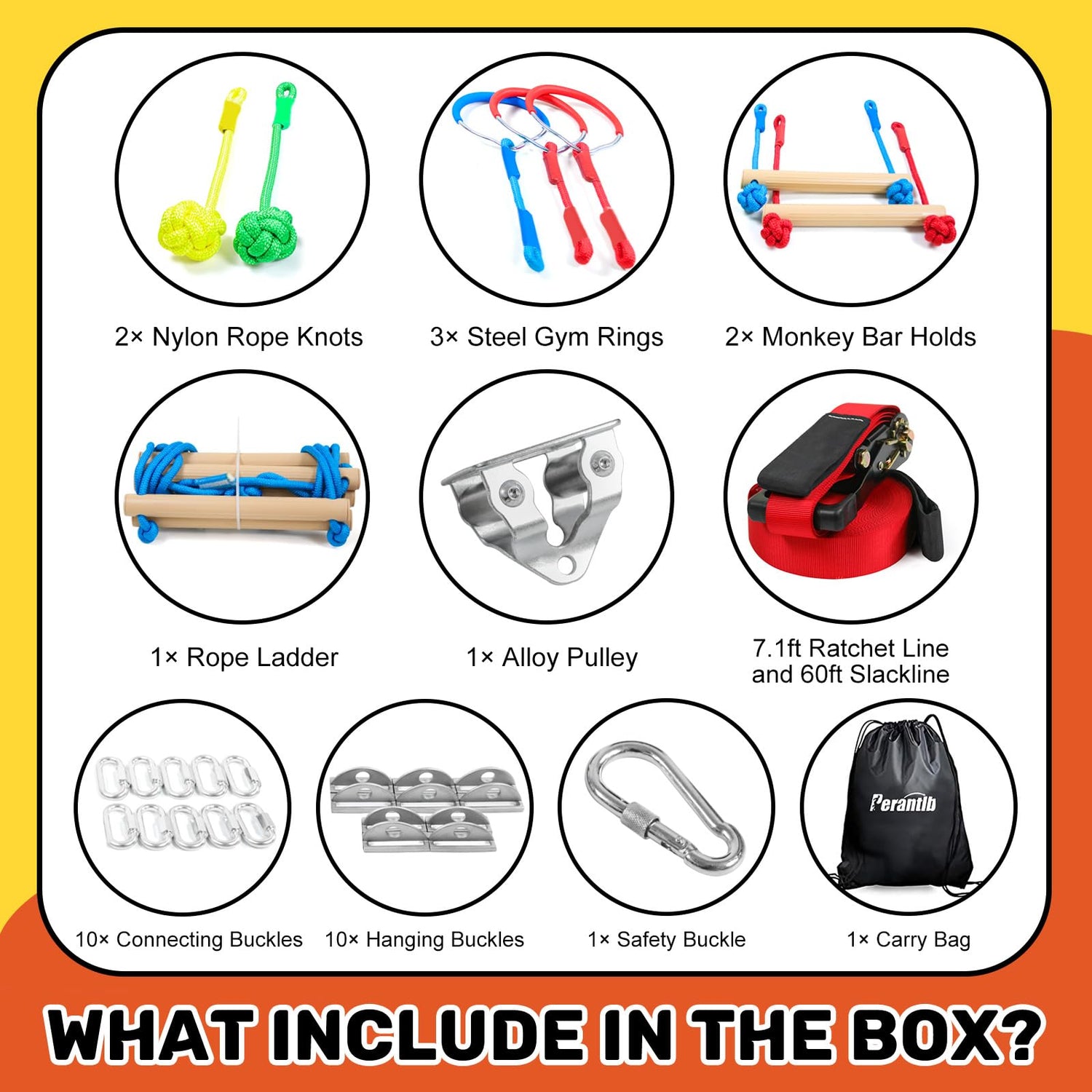 - 【Premium Quality】Perantlb Ninja Warrior Obstacle Course is made of very durable slackline webbing and ratchet webbing, that can hold up to 440lbs. Our kit set include a 60ft slackline and 7ft ratchet line, 2 Monkey bar holds, 3 steel gym rings, a rope ladder, a free carry bag, 2 nylon rope knots, 10 hooks, 10 hanging buckles , 1 Triangle buckleand 2 tree protectors. All components are carefully tested for strength and durability.