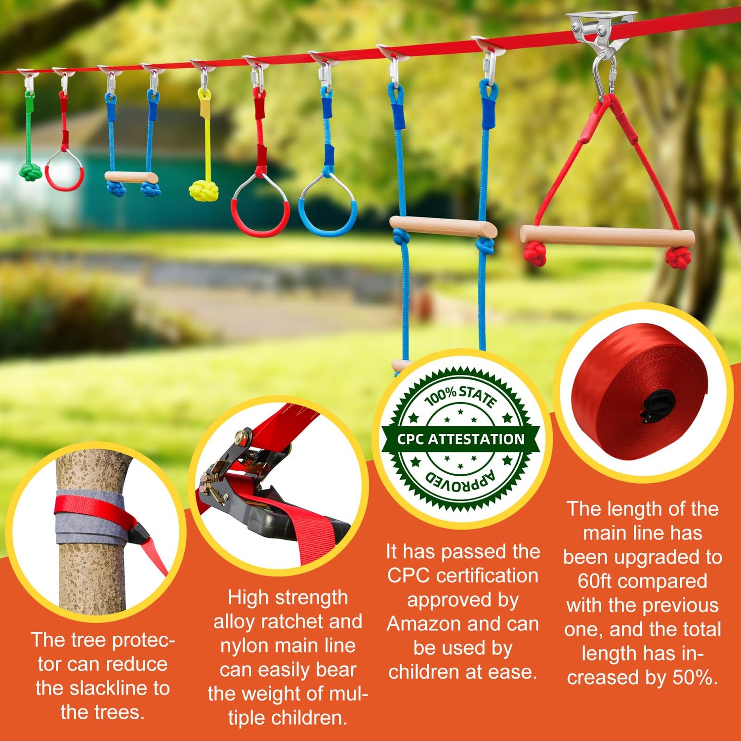 Ninja Warrior Obstacle Course for Kids,60ft Ninja Slackline-with 8 Pcs Accessories,Tree Protector & Carry Bag Ninja Course for Kids Outside-Backyard Zip Line for Kids