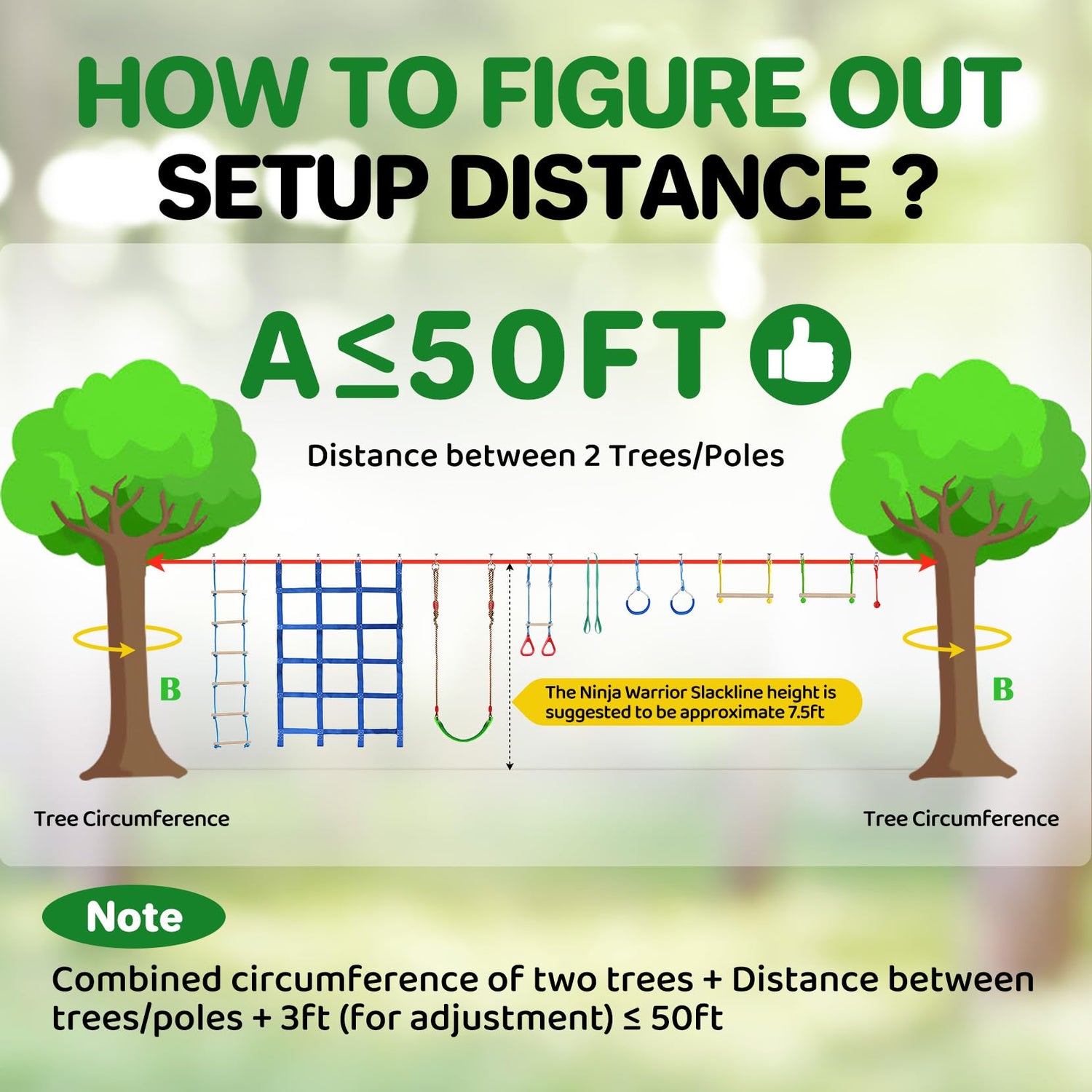 - GREAT ALTERNATIVE TO THE PLAYGROUND -Whether or not you want to get a swing set or jungle gym when all of the playgrounds closed, but don't have enough flat space in your yard and they're expensive? Choose our Dripex ninja obstacles course, all you need is two mature trees or pillars that can withstand a maximum distance of 39-42ft and a maximum weight of 400lbs.
