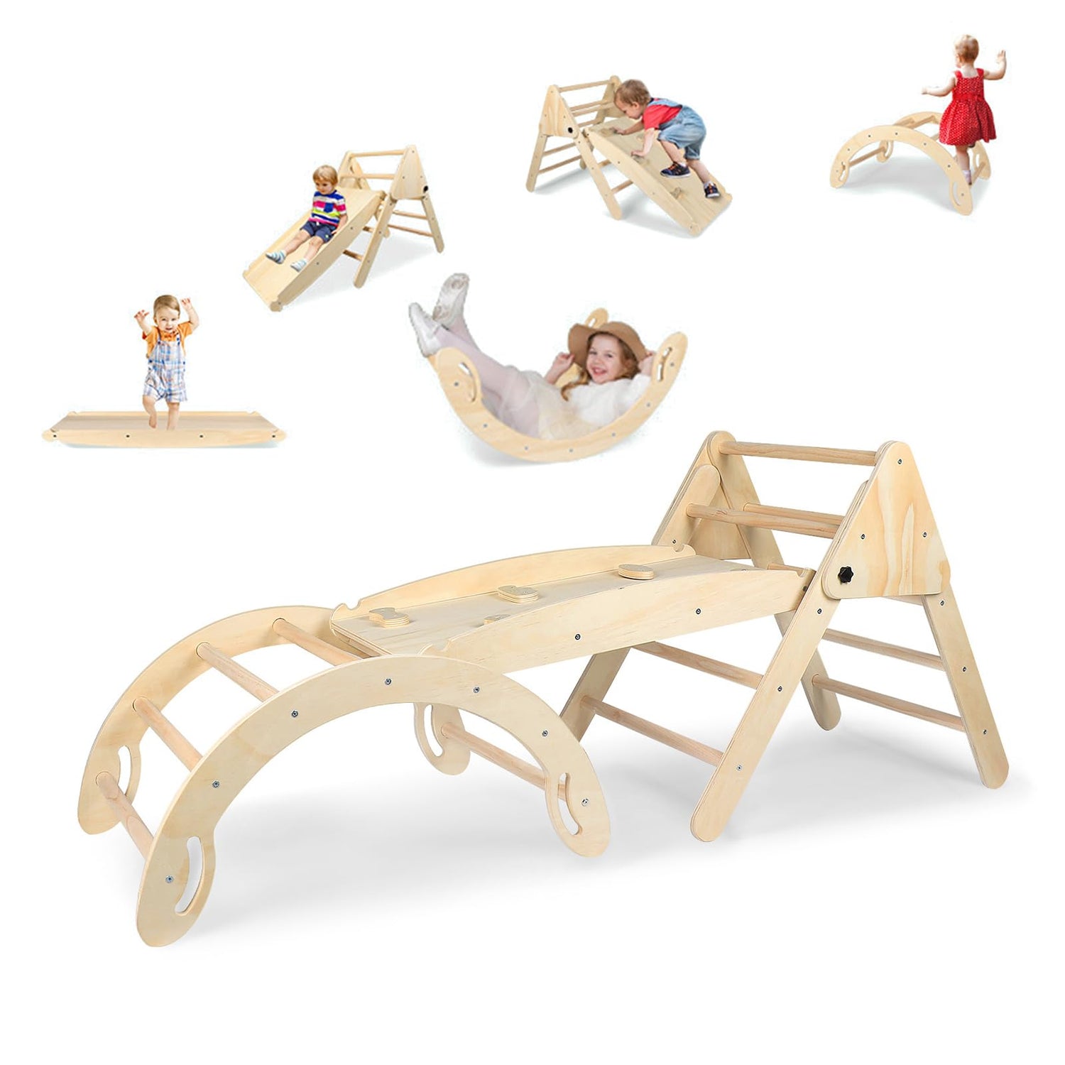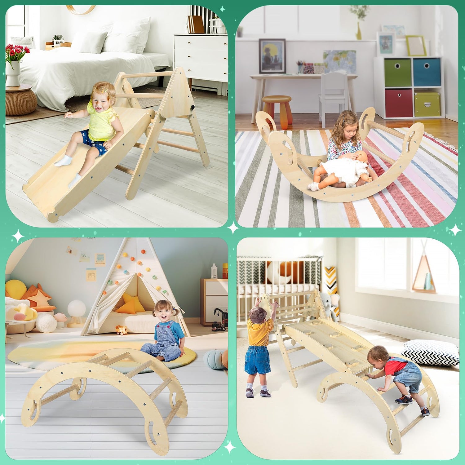 - 【5-IN-1 MONTESSORI CLIMBING TOY】This pikler triangle set consists of 3 parts, it can be used as a triangle ladder, arch climber, rocking chair, slide, climbing bridge etc. Different combinations will bring various fun, and keep your little ones away from the smartphone or tablet screens.