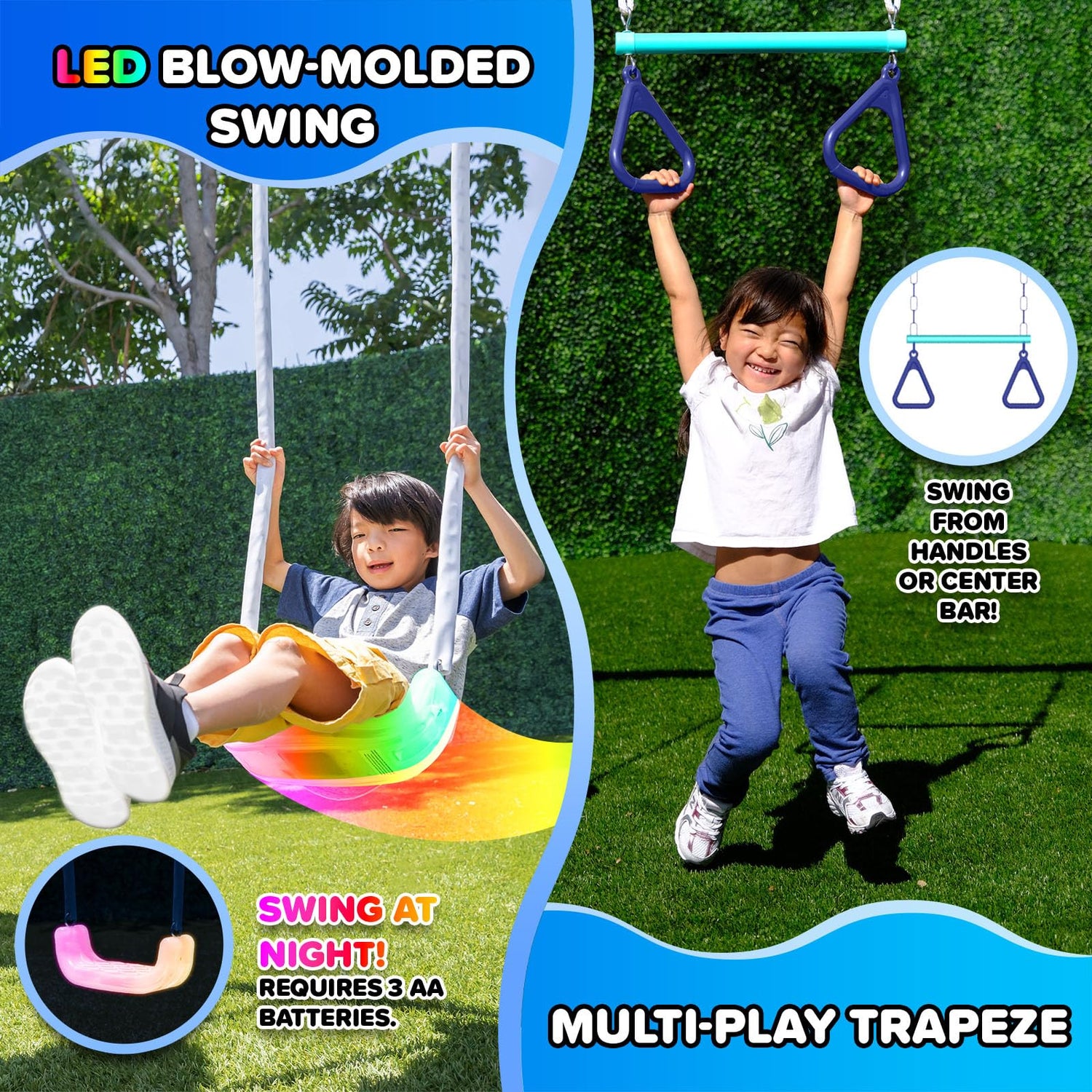 - [7 TIMES THE FUN] Swing Set features: 1 5-ft slide, 1 trapeze, 1 LED blow-molded swing, 1 climbing net, 1 climbing ladder, 1 2-person skyflyer, and 1 basketball hoop with backboard. Supports up to 7 kids at once (700 lbs maximum weight). Allows up to 8 kids to play on it at once.