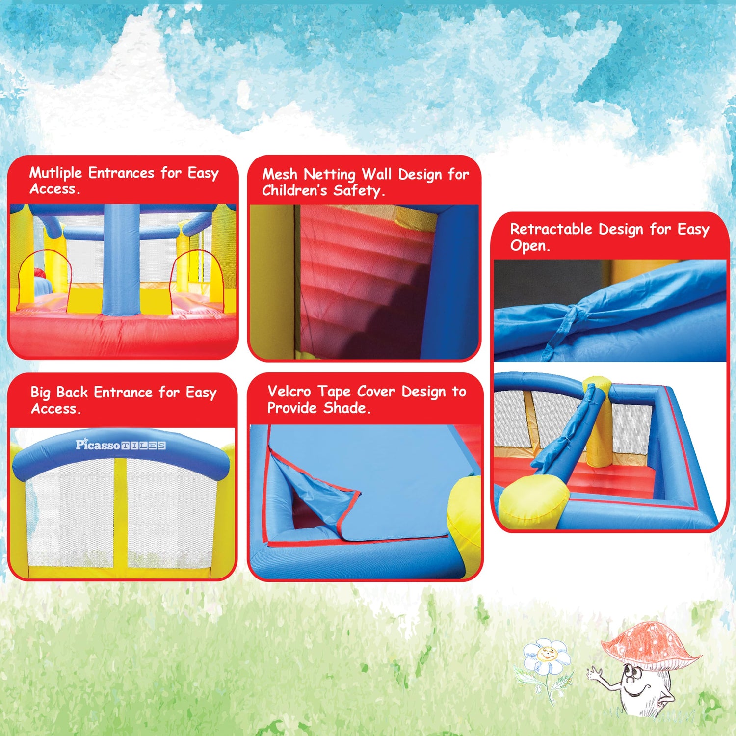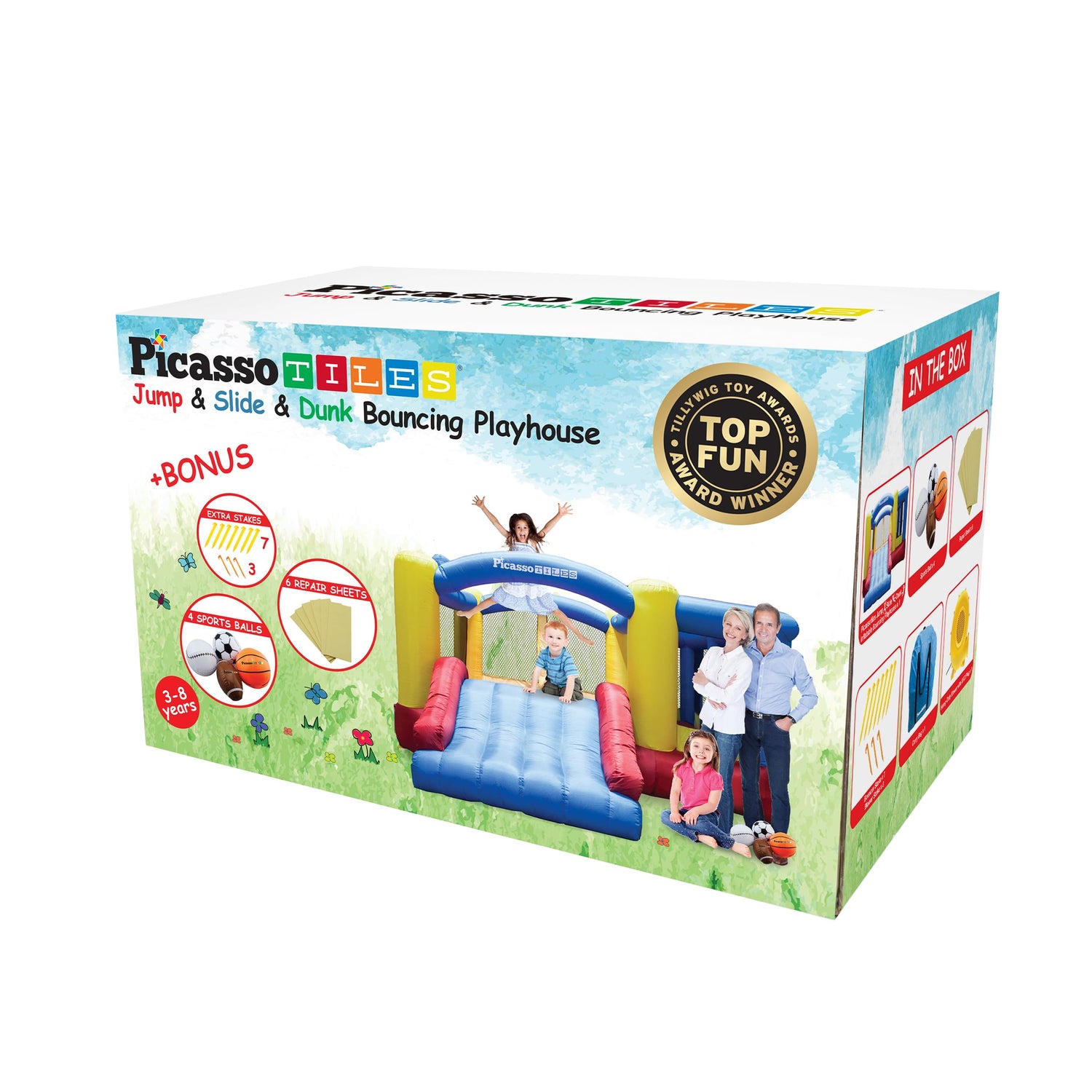 [Upgrade Version] PicassoTiles KC102 12x10 Foot Inflatable Bouncer Jumping Bouncing House, Jump Slide, Dunk Playhouse w/Basketball Rim, 4 Sports Balls, Full-Size Entry, 580W ETL Certified Blower
