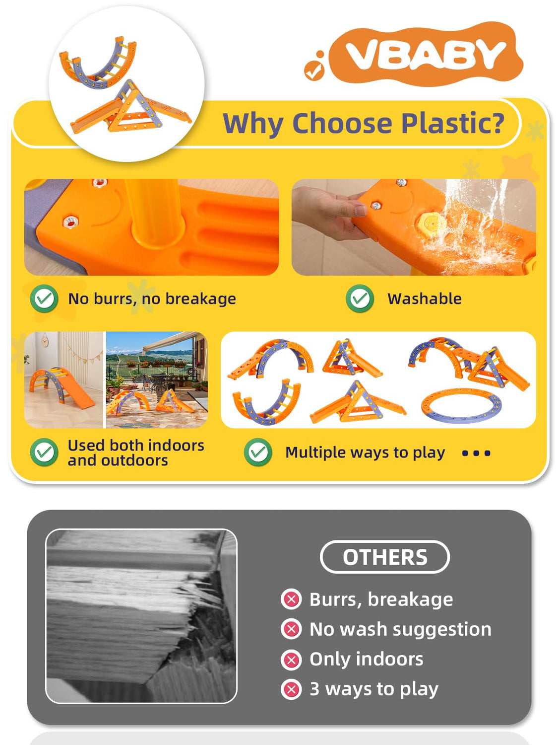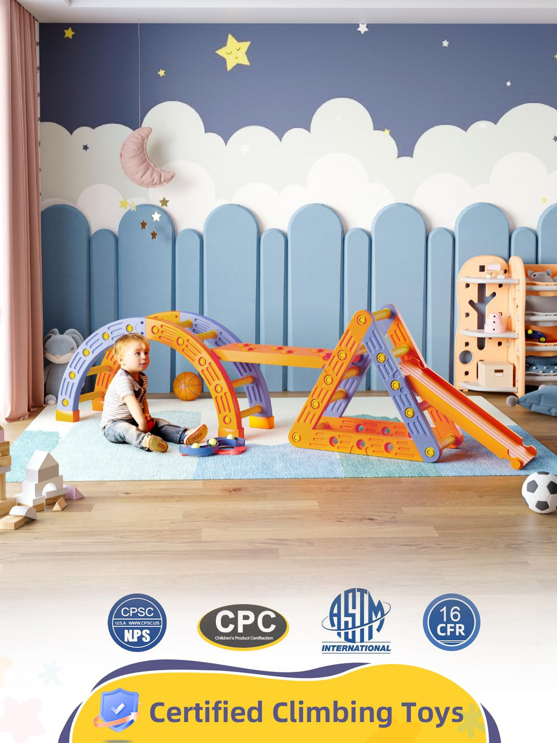 - MULTI-PLAY TODDLER CLIMBING TOYS - Bring creativity to your child with our versatile montessori climbing set. 1 arch, 1 triangle climber and 2 slides make dozens of play combinations. Suitable for children from 1-6+.