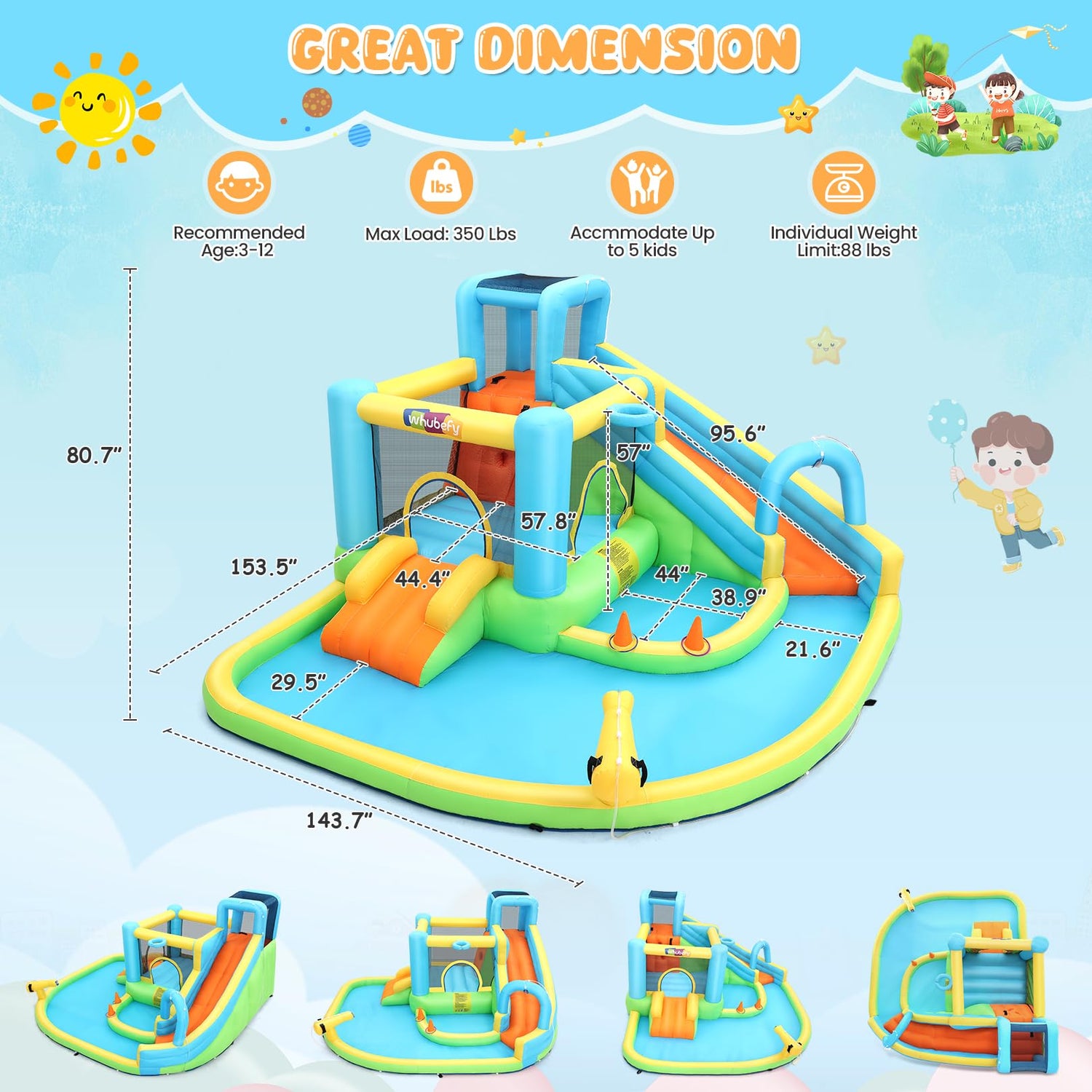 - MEGA INFLATABLE WATER BOUNCE HOUSE COMBO: Whubefy Inflatable Bounce House water slide is 153.5" x 143.7" x 80.7" after inflate, Jumping Area: 57.8" x 44.4".The inflatable jumping house is bigh enought for 3-5 children play together. An amazing inflatable outdoor playset for kids for outdoor backyard is suitable for yard, birthday party, lawn, amusement park, Kindergarten, children's park etc. Save more money, do not have to rent the Commercial Bouncy castle, and no more long lines at the park.Can be re-used repeatedly for many years, with the growth of kids