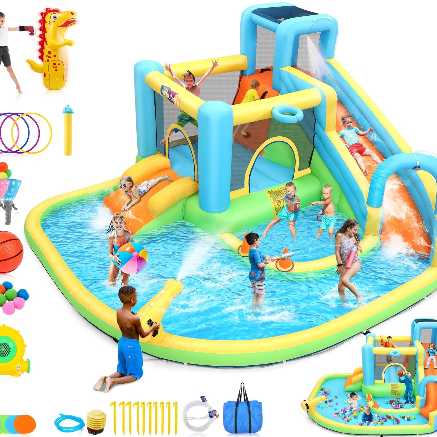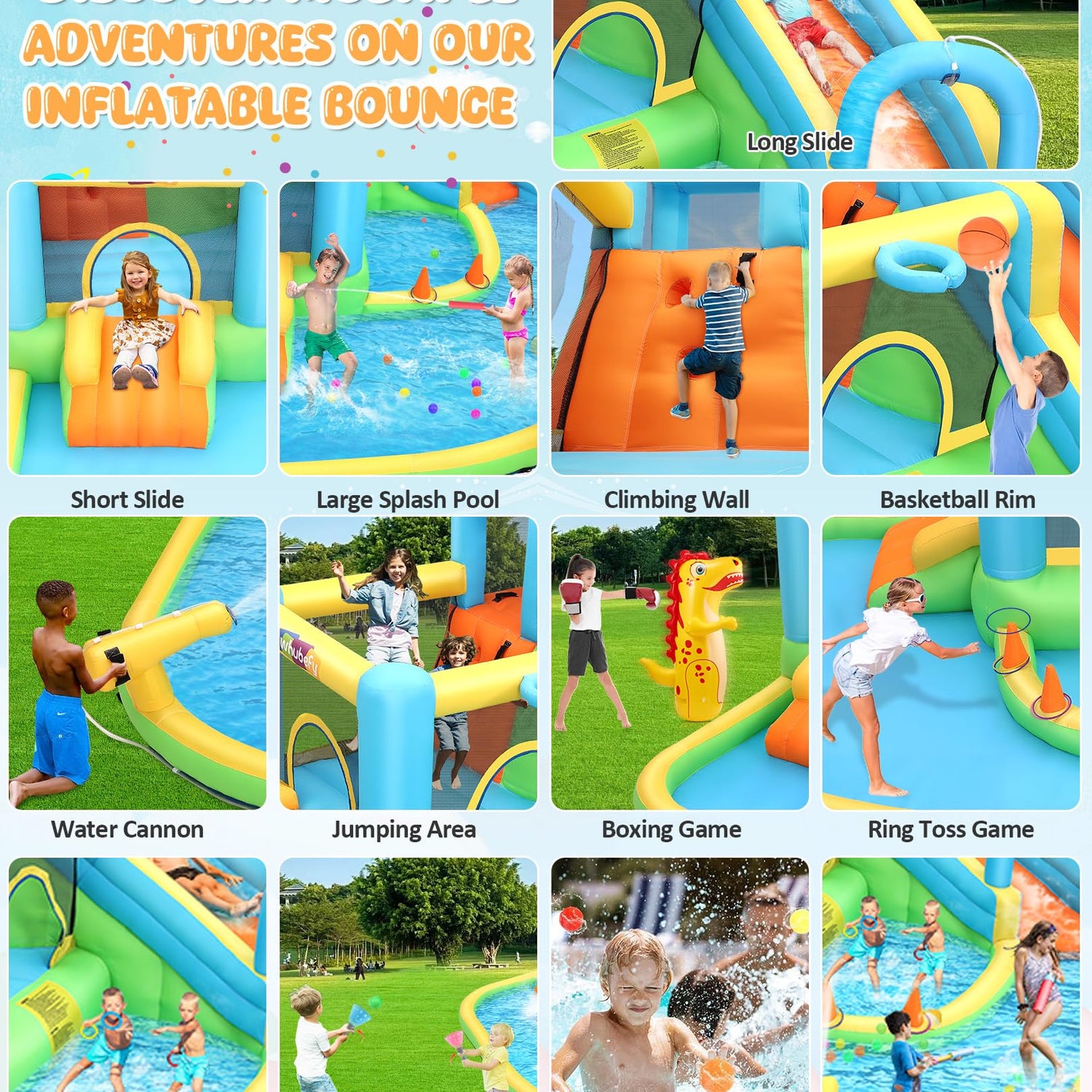 • 💦13-IN 1 Backyard Bouce House Water Slide Set: The Whubefy water bounce house is packed with features for non-stop entertainment. Kids can race down two slides into splash pools, burn off energy in the spacious bouncing area, or challenge themselves on the built-in climbing wall and basketball hoop. For added excitement, there's a water cannon for splashy battles and two ring toss games(4 rings included). Additionally, the set includes a dinosaur punching bag, 10 water soaker balls and a a pair of catch ball set.