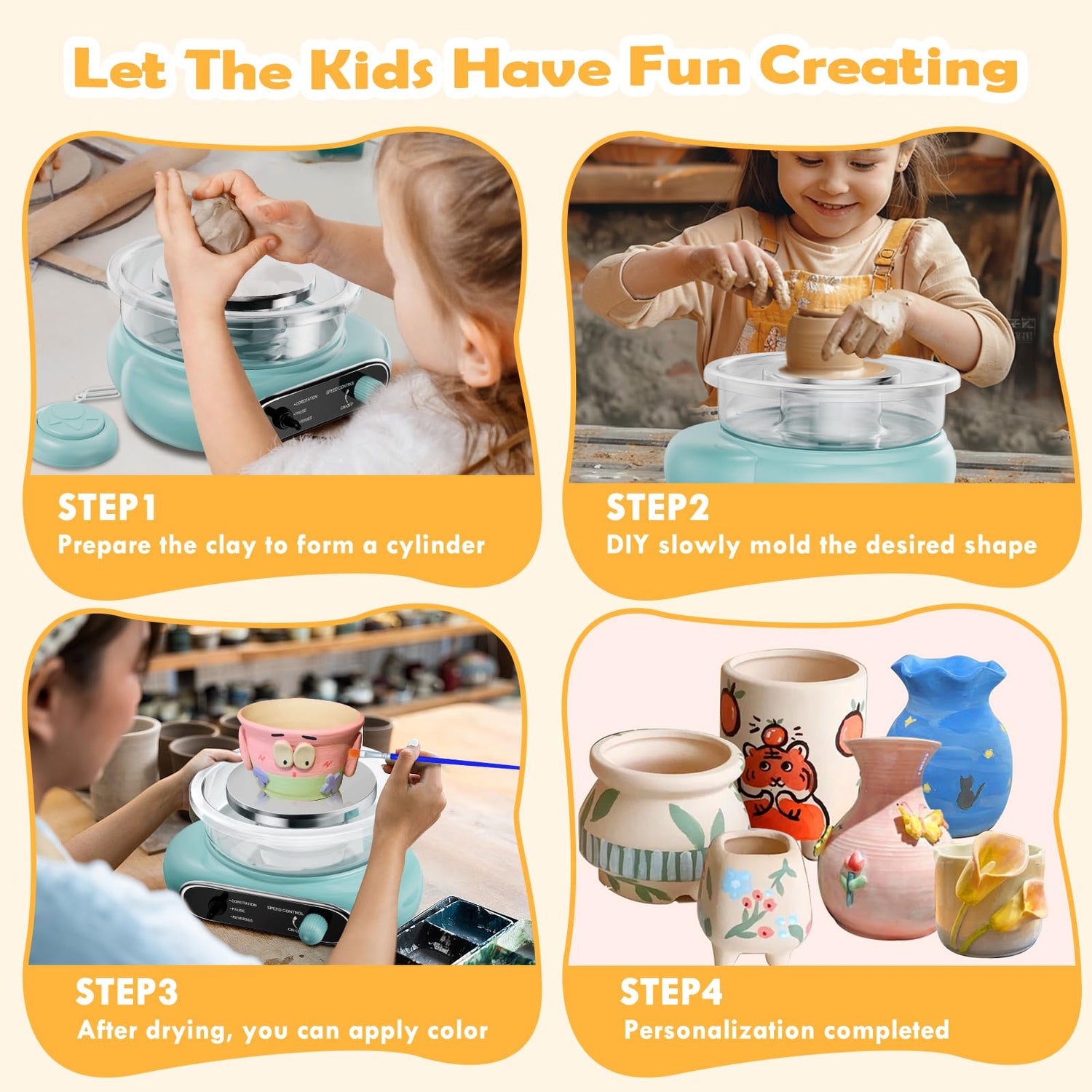 - Pottery Wheel for Kids: Our Kids Pottery Wheel Set is made of high quality and safe materials. Simple appearance design, let the child enjoy the fun of creation. A power cord is included to power the pottery wheel, DC power outlets provide a more stable power supply. We include an easy-to-follow user guide, ensuring newcomers to pottery can promptly get started without any complications.