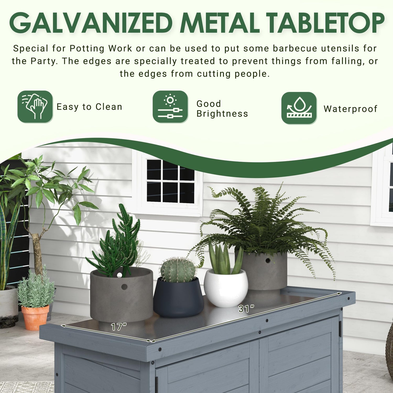 AECOJOY Outdoor Storage Cabinet, Solid Wood Planting Work Bench, Garden Potting Bench Table with Metal Tabletop and Adjustable Shelves, Grey