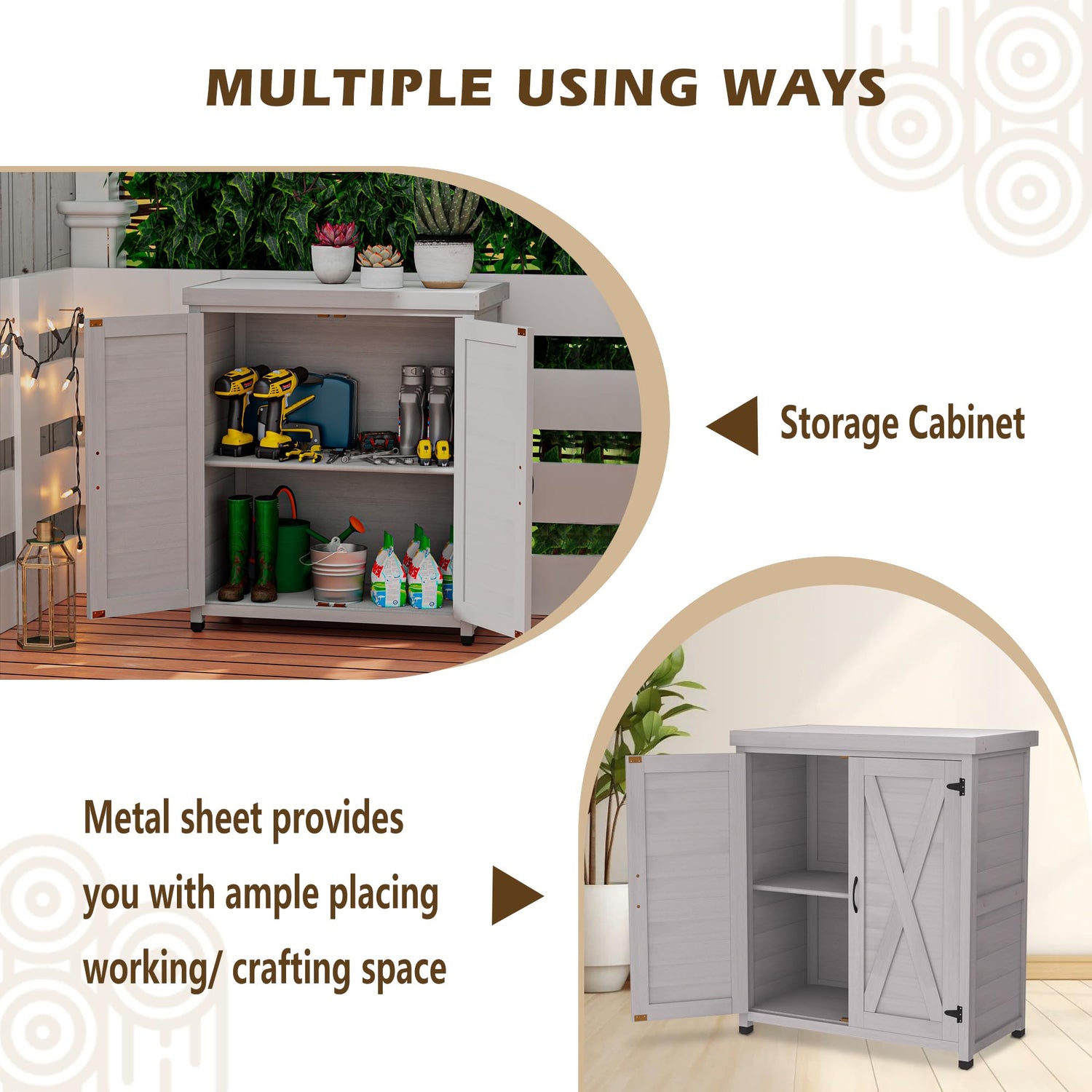 Outdoor Potting Bench Table with Storage Cabinet & Metal Tabletop 36" Tall Cedar Wood Garden Workstation for Patio, Balcony, Porch, Grey