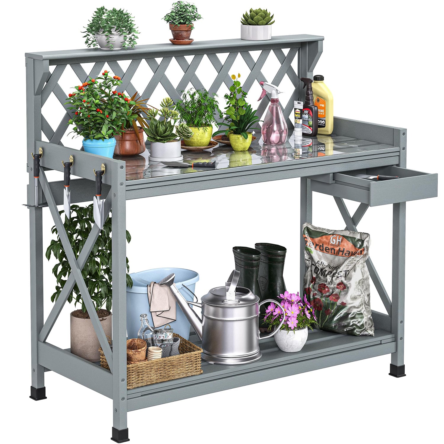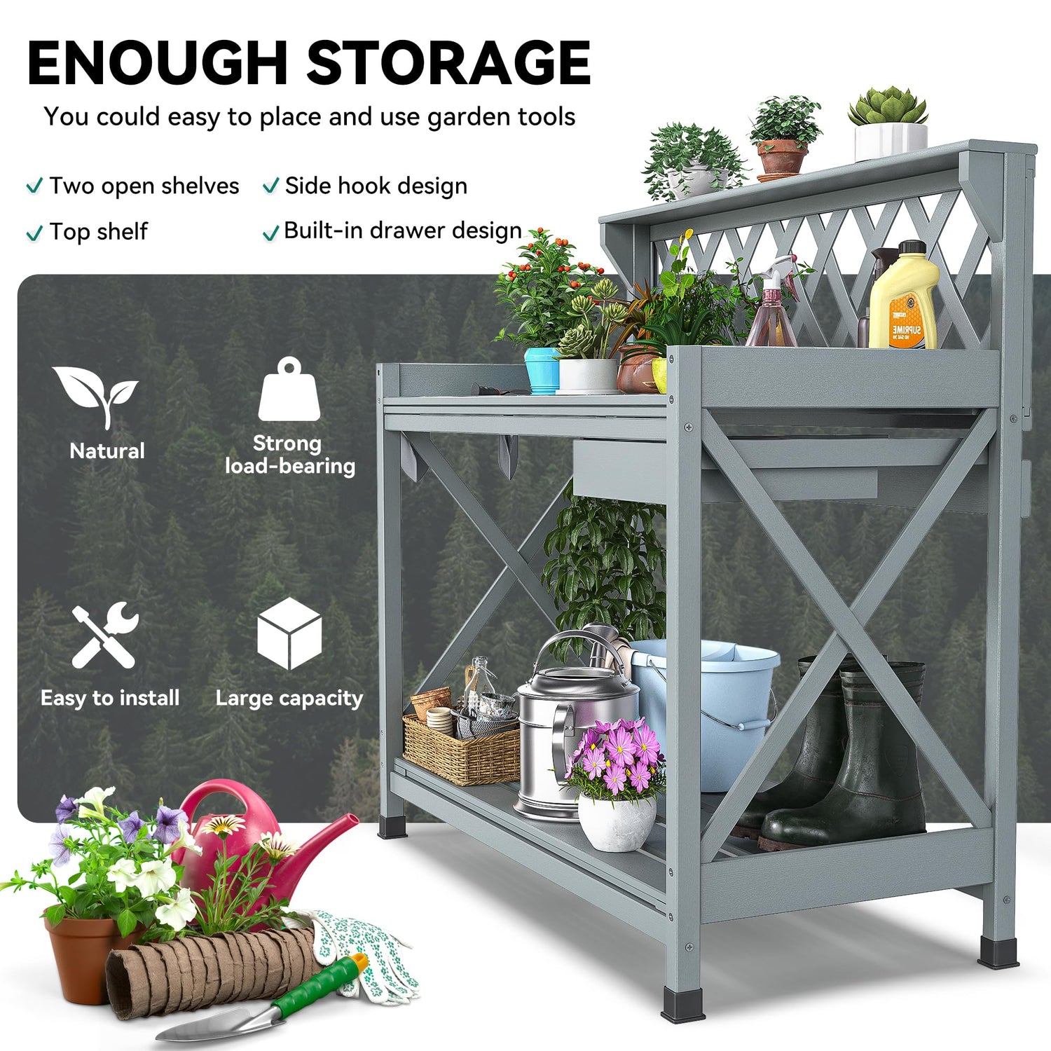 YITAHOME Potting Bench Table, Outdoor Garden Work Bench Station Table w/Drawer, Open Shelf, Hook, PVC Waterproof Mat (Grey)