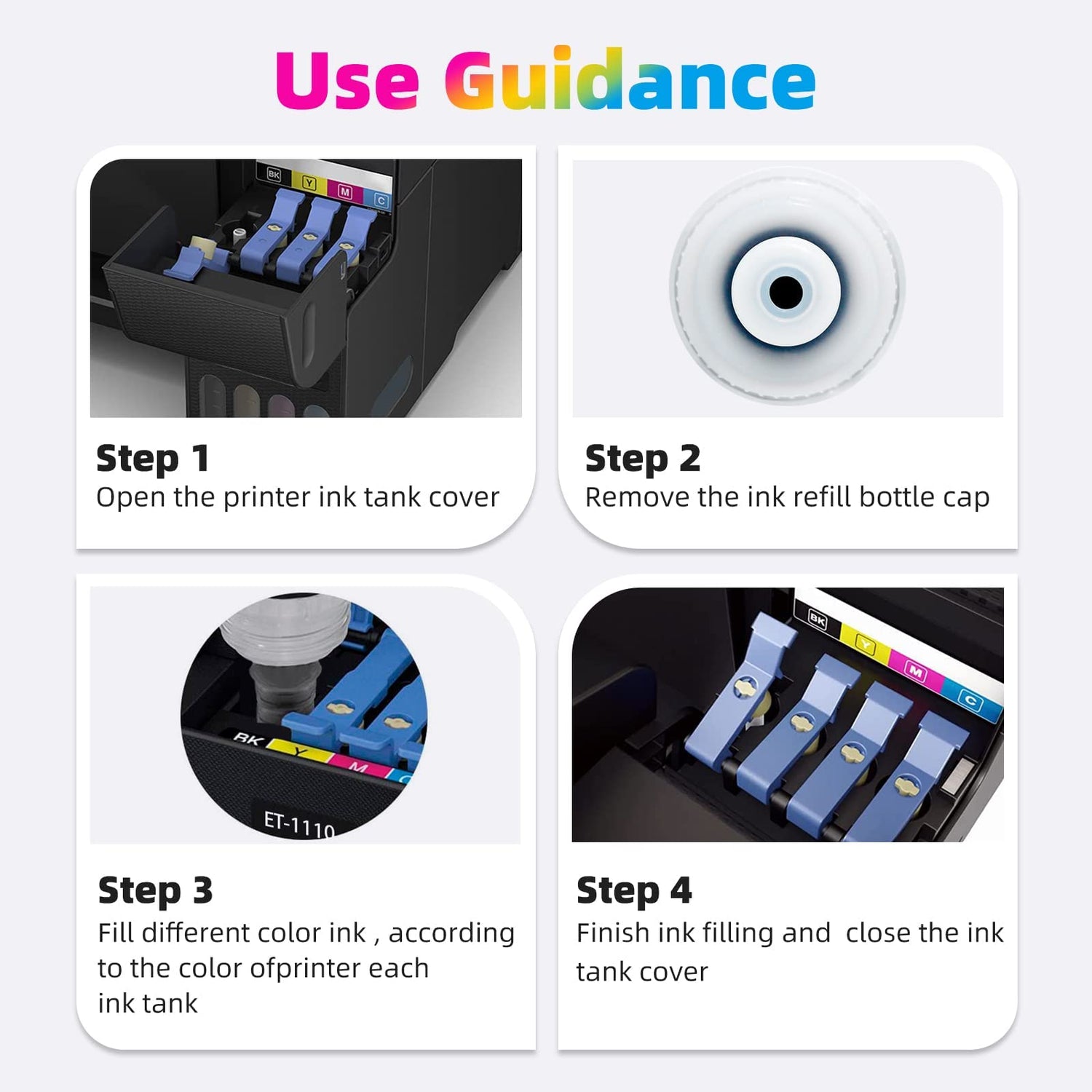 - 【Compatible Printers】: Compatible for Epson ET-1110/ET-1810/ET-2400/ET-2710/ET-2720/ET-2800/ET-2803/ET-2810/ET-2811/ET-2820/ET-2840/ET-4700/ET-4800/ET-4810 Printers.Please confirm your Printer Model to ensure that you purchase the correct ink bottle.