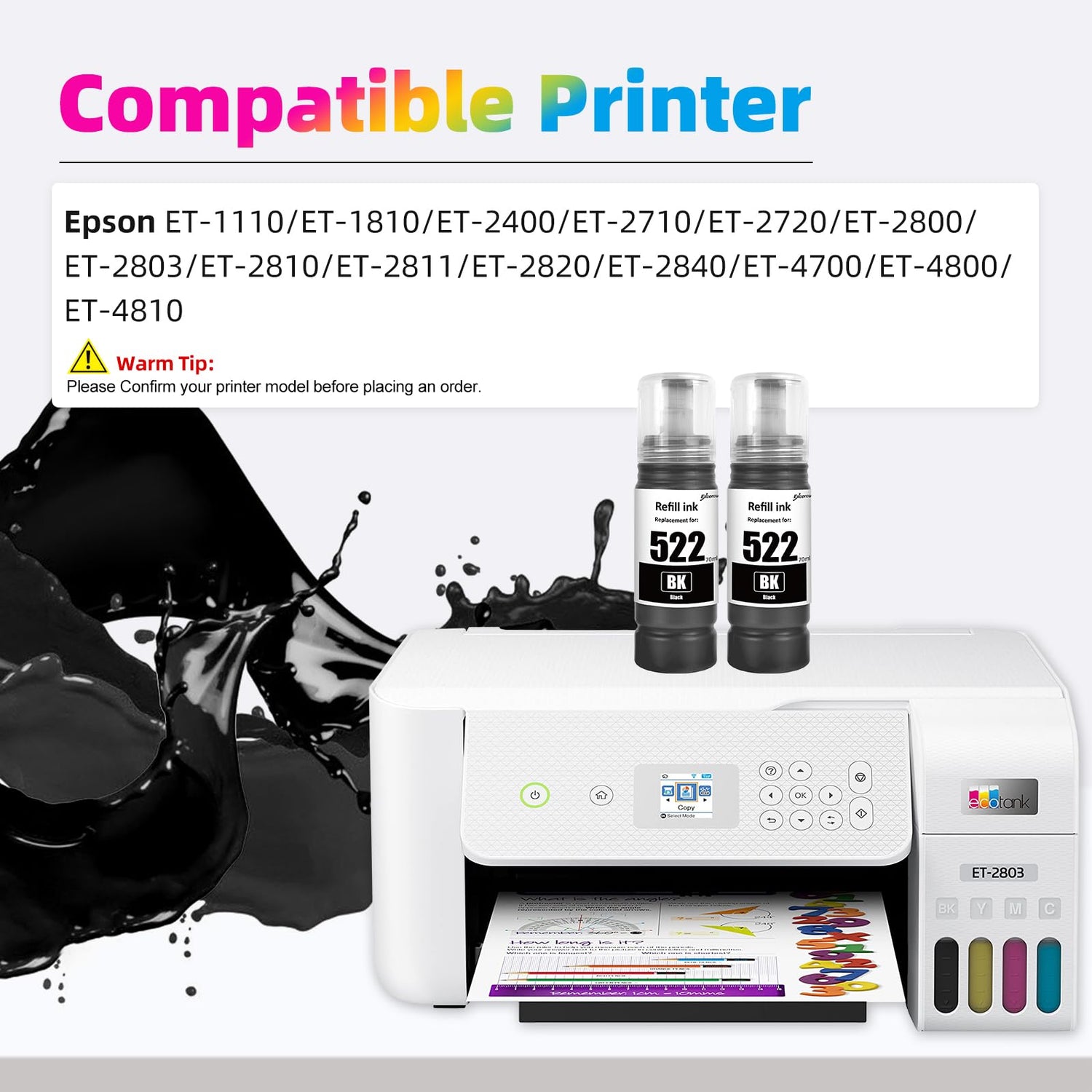 - 【High Page Yield】:Up to 4500 pages per T522 522 black ink refill bottle (at 5% coverage on A4 paper)