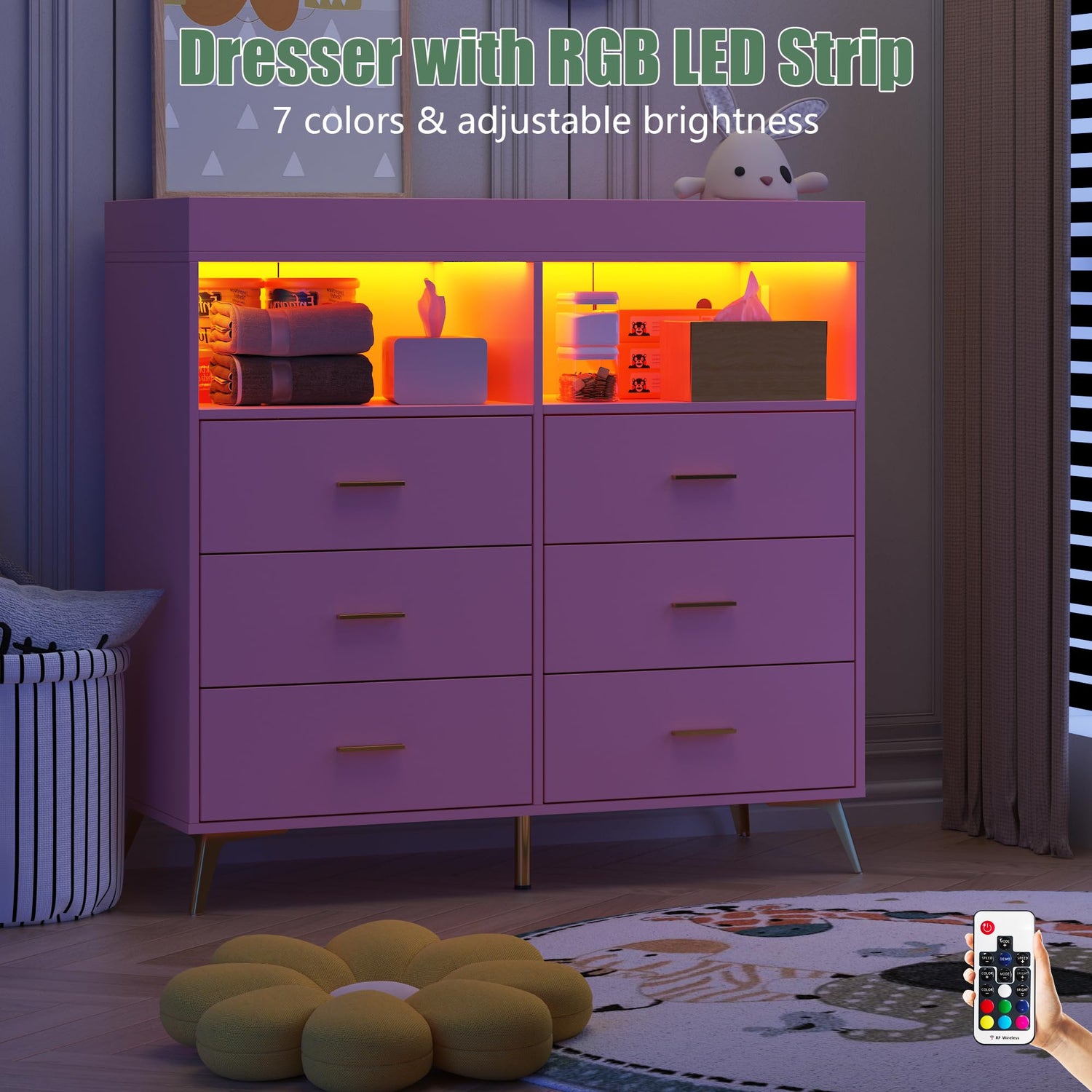 GarveeHome Dresser for Bedroom with 6 Drawers, Baby Changing Table Dresser with Changing Pad, LED Lights & Charging Station, Baby Changing Station with Changing Table Top, Pink