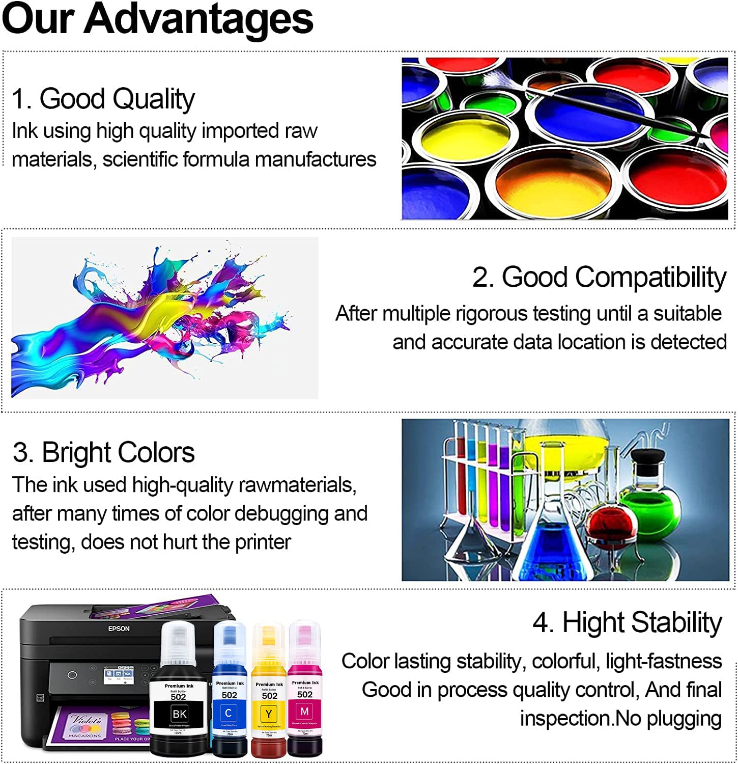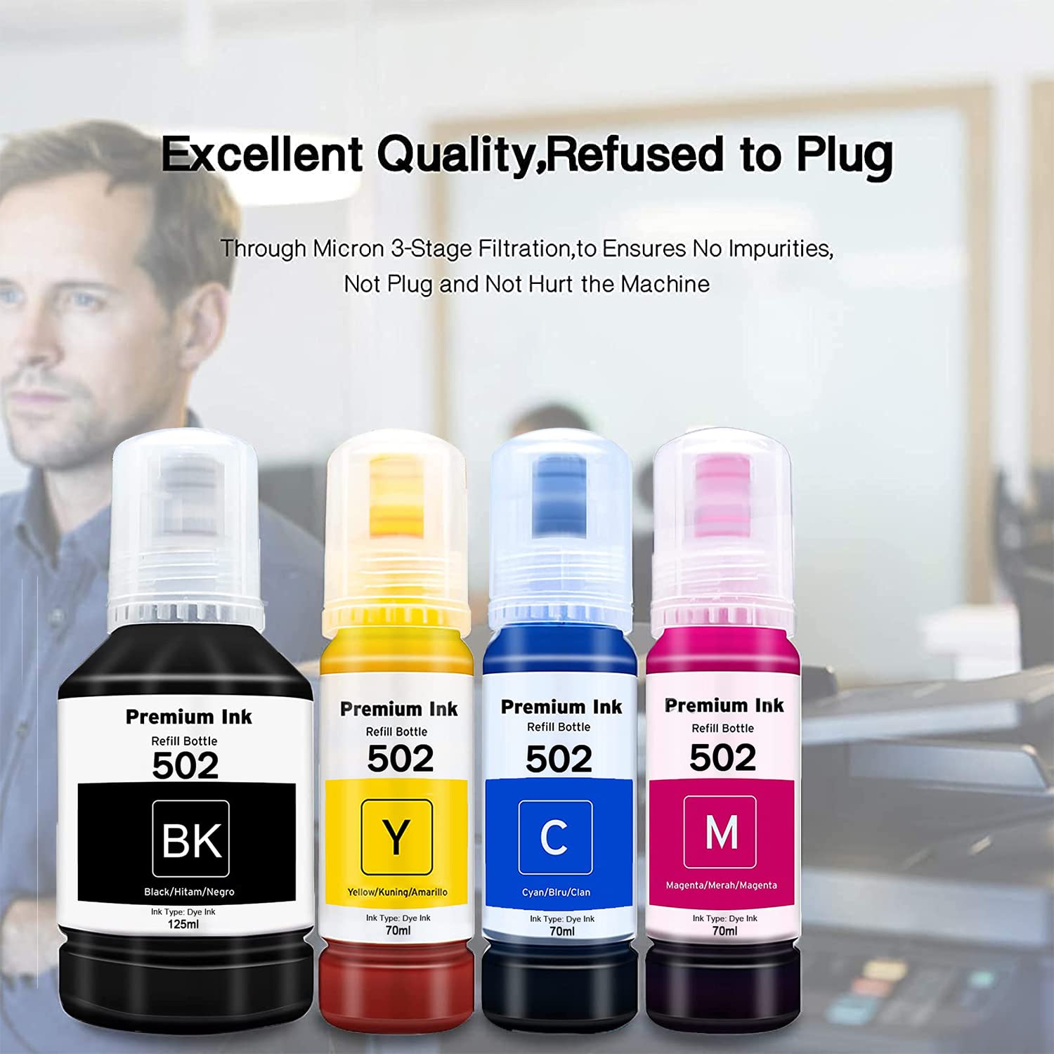 - LARGE VOLUME. (127ml Black 502 ink bottle, 70ml Cyan 502 ink bottle, 70ml Magenta 502 ink bottle, 70ml Yellow502 ink bottle), the estimated page yield of 1 black bottle is up to 7500 pages and 6000 pages for every color bottle ( Calculated at 5% coverage on the A4 document )