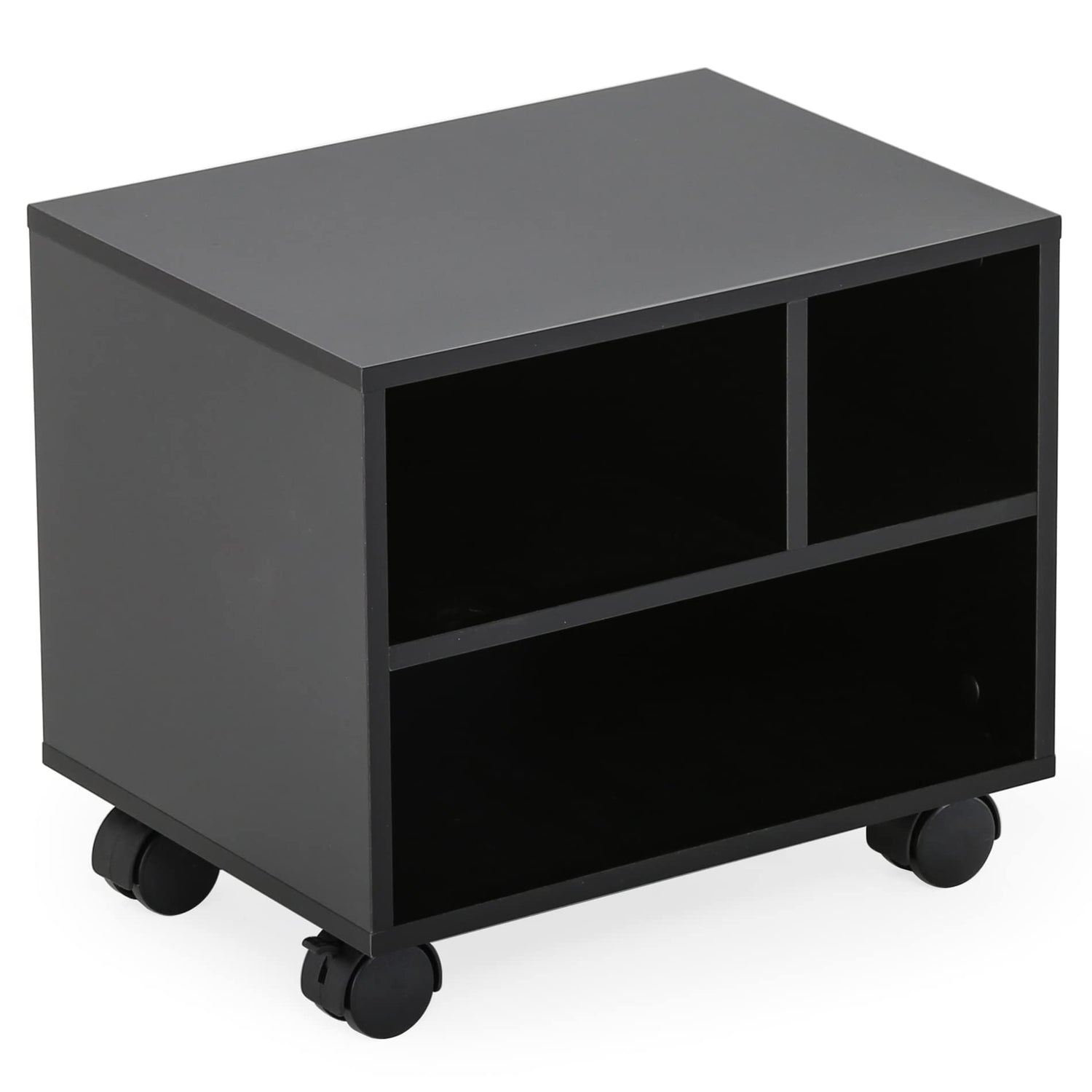 FITUEYES Mobile Printer Stand with Storage, Under Desk Black Wood Small Rolling Printer Table Work Cart with Wheels and 3 Compartment Organizer Spaces for Home Office, 15.7 x 11.8 x 13.8