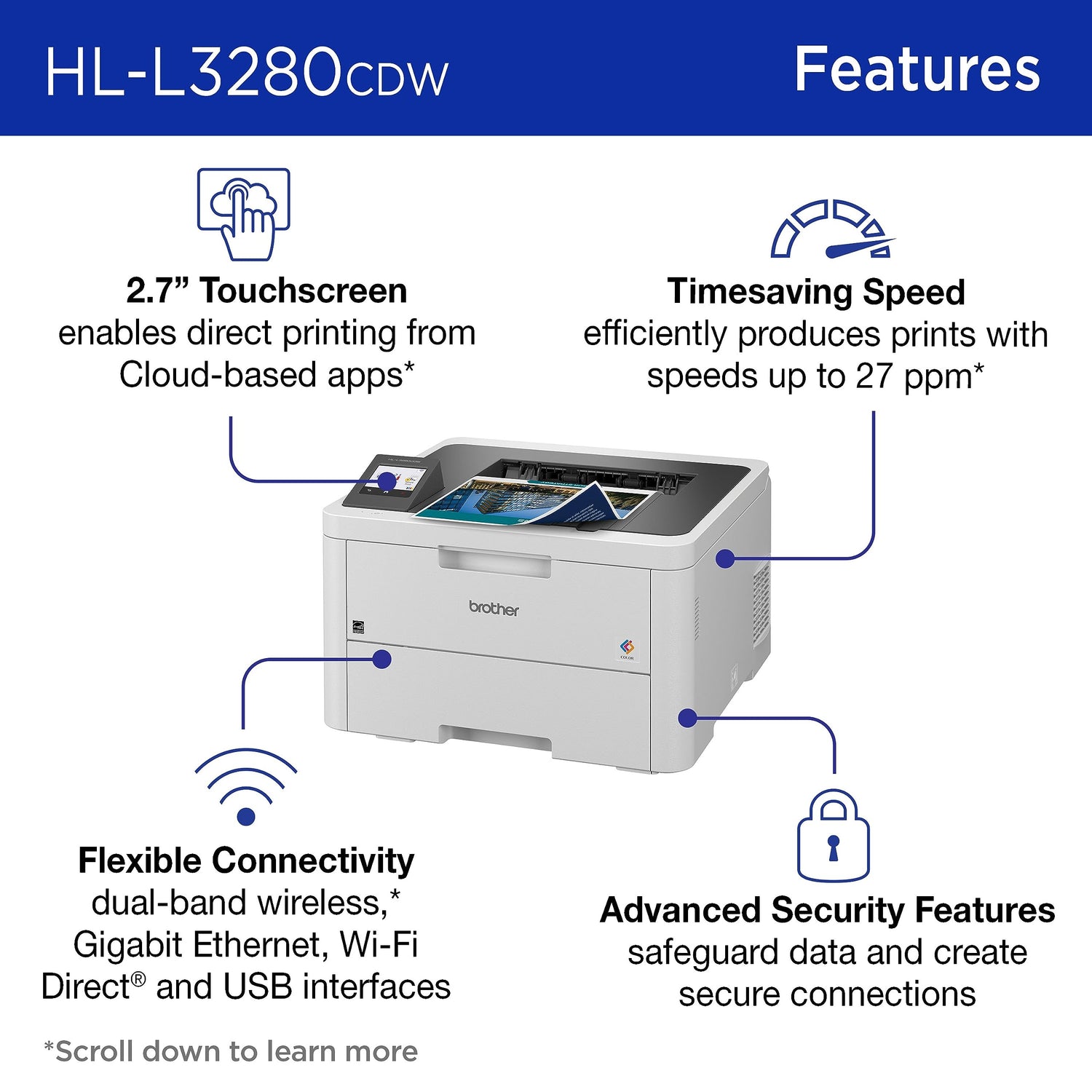 Details: The Brother HL-L3280CDW wireless digital color printer is engineered to optimize efficiencies while working from home or in shared workspaces. Compact, capable, and reliable, this high-volume printer combines steady connectivity options with consistent performance, and premium laser-quality printing for smudge-free documents that position you for success. Always ready to get to work whenever you are, its print-forward features include speeds up to 27 pages per minute (ppm)(2), an intuitive 2.7” touchscreen, dual-band wireless(5) connectivity, and mobile device compatibility(6) for ease of use and ready accessibility. ENERGY STAR® compliant and EPEAT® Silver rated, the HL-L3280CDW is designed with eco-friendly printer features including Eco Mode, Toner Save Mode, and automatic duplex printing. For peace of mind printing, advanced security features safeguard sensitive information and create secure connections to devices and networks. Engineered and supported by Brother with a 1-year limited warranty and free online, call, or live chat support for the life of you printer, the HL-L3280CDW fits seamlessly into any small, busy workspace. 4. Disclaimers 1. Requires enrollment in a monthly billed Brother Refresh EZ Print Subscription service plan based on monthly printed page allotments. Unused pages roll over, limitations apply. Additional page set charges and taxes apply during trial. Plan, options offer, and pricing subject to change. Open to new subscribers located in the contiguous United States only. After the free trial period your credit card will be charged on a monthly basis for the Plan Fee, Overages, and Taxes in accordance with the Terms of Service. Overage fees will apply during free trial. Your service will continue on a month-to-month basis until you cancel it. May be canceled at any time. Upon cancellation, cartridge will be deactivated and must be replaced at users’ expense in order to continue printing. 2. Based on one-sided printing. Change from default setting required. 3. Maximum capacity based on using 20 lb. paper. 4. Requires an Internet connection and an account with desired service. 5. Requires connection to a wireless network. 6. Free app download and wireless connection required. Compatibility may vary based on device and operating system. 7. Based on monthly subscription cost in U.S. for Color Laser High Plan vs. average cost per page of eligible like standard capacity cartridges. Savings will vary based on Refresh EZ Print Subscription plan selected. Wi-Fi Direct is a registered trademark of Wi-Fi Alliance®. EPEAT is a trademark of the Green Electronics Council in the United States and other countries. ENERGY STAR and the ENERGY STAR mark are registered trademarks owned by the U.S. Environmental Protection Agency. Images are for illustrative purposes only. Specifications subject to change.
