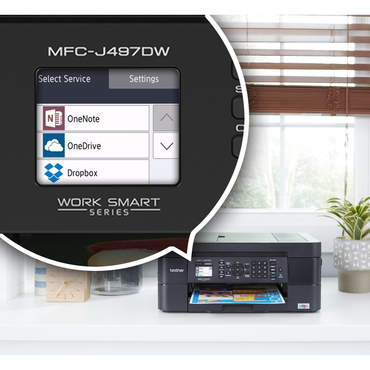 Details: The Brother work Smart Series MFC-J497DW is easy to connect, compact, affordable and loaded with features and functionality to help boost productivity in your home, Home office, dorm room or small office. This wireless color inkjet all-in-one delivers high-quality output, lets you reliably Print, copy, scan and fax and enables wireless mobile device printing from your desktop, Laptop, smartphone or tablet (requires connection to a wireless network). use the automatic document feeder and 100-sheet capacity paper tray for generous output without constant monitoring and help save paper with automatic duplex (2-sided) printing. Cloud connectivity lets you scan-to popular cloud services directly from the printer (requires an Internet connection and an account with desired service). Comes with a one-year limited warranty and free online, call, or live chat support for the life of the printer.